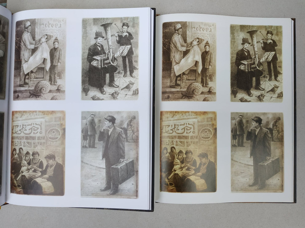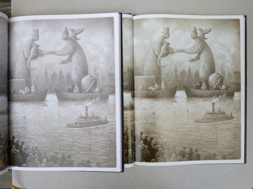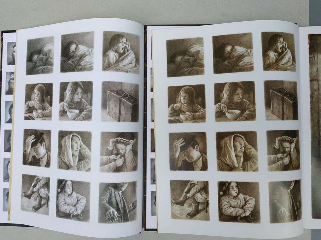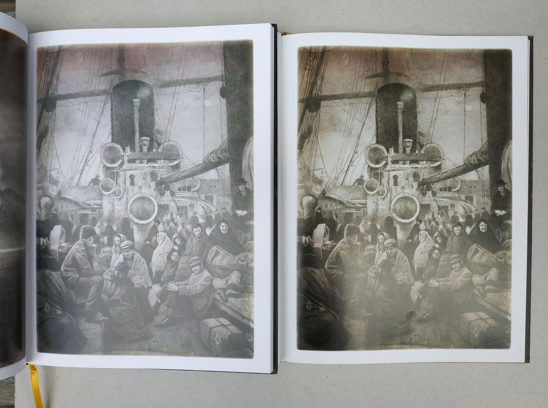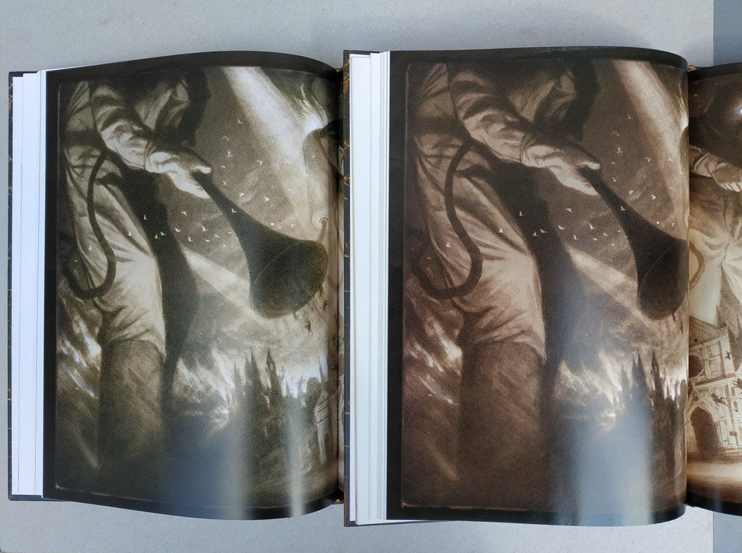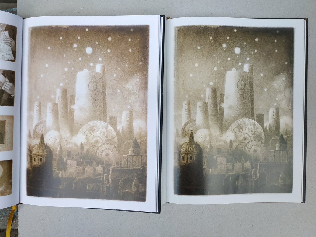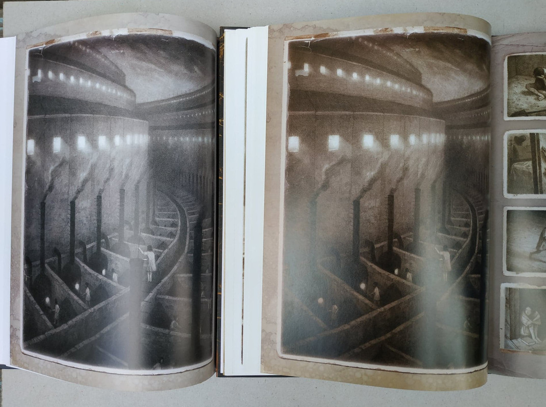 Polskie wydanie jest ołówkowe, wypłukane z sepii (może taki był pierwszy z 2006?), czasem nierówna tonacja na sąsiednich stronach i niekiedy lekko przebijająca czerwień lub żółć. To brytyjskie trzyma tonację starych fotografii.