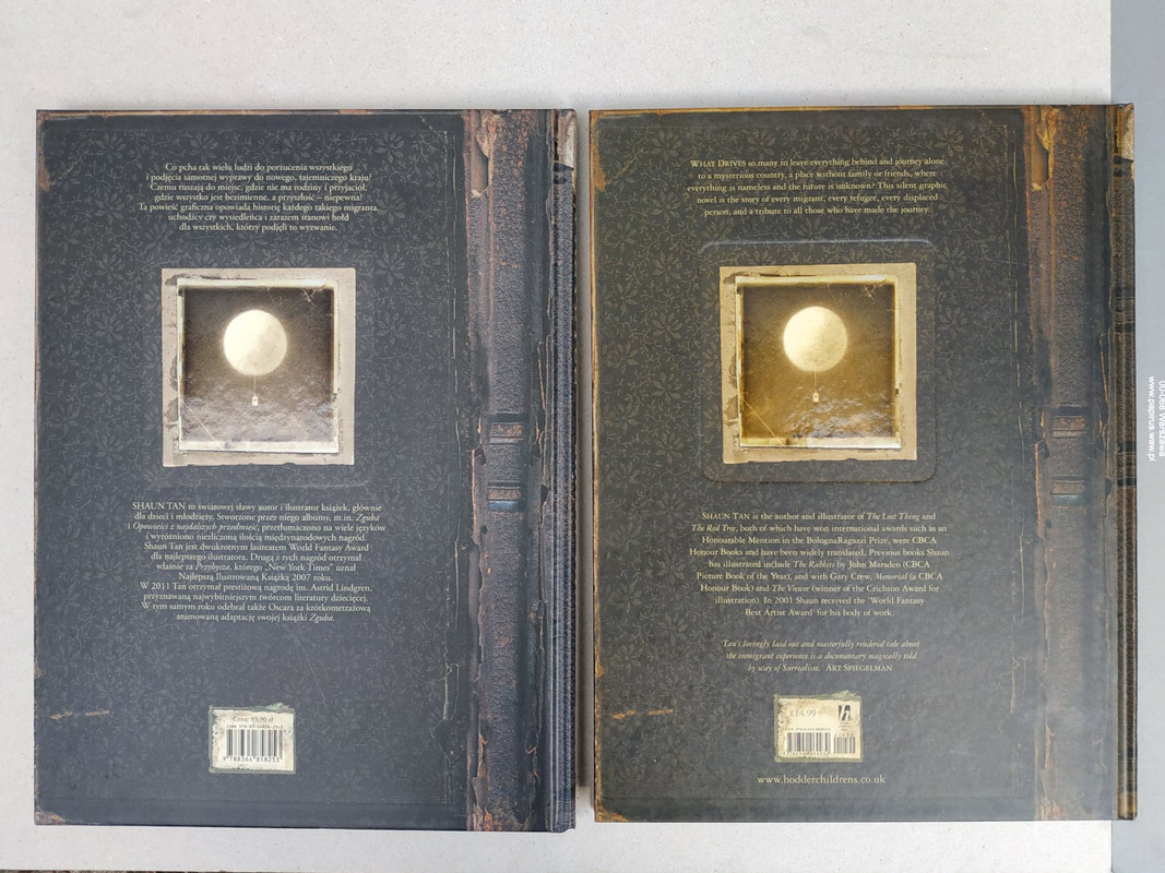 Twoje wydanie może być jeszcze inne, przykładowo inaczej zrobili tylną okładkę - w tych co mam oprócz tekstu jest mała ilustracja pod lakierem, w brytyjskim jeszcze w tłoczeniu. Mam domysł, czemu w polskim jest widoczne niezrealizowane tłoczenie: to brytyjskie wg notki projektował Tan i mógł sam w plikach od razu zaznaczyć obszar tłoczenia na przedniej i tylnej, nasi zaś nie tłoczyli, a chyba korzystali z tych właśnie plików i nie uznali, że warto w grafikę ingerować.