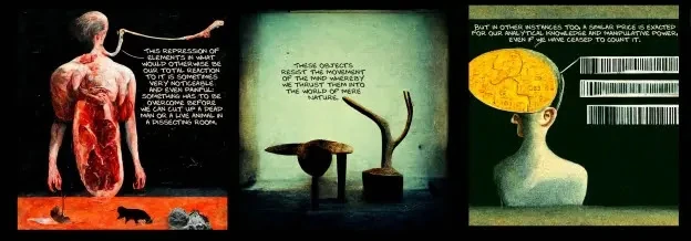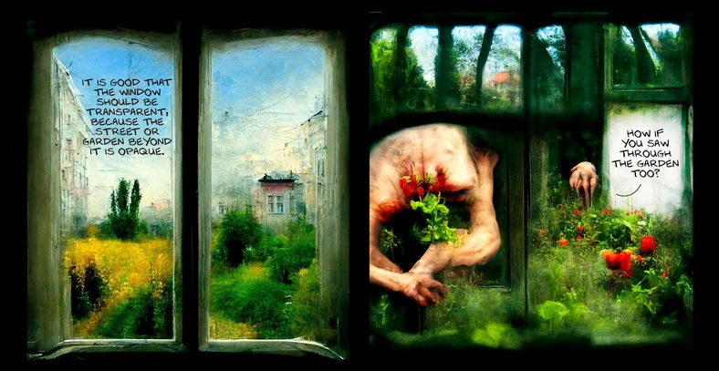 DALL-E opracowanym przez OpenAI) tworząca surrealistyczne i niepokojące obrazy na podstawie opisów tekstowych. Twórca mema zestawił wybrane przez siebie słowa ze stylem mistrza Beksińskiego. Według mnie SI poradziła sobie całkiem nieźle i stworzyła ciekawe warianty grafik.