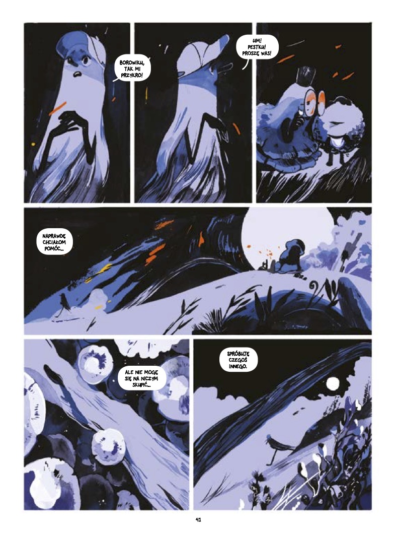 Cena: 75złFormat: 210 x 260 mmIlość stron: 164 koloroweOkładka twardaOprawa szytaPapier: Munken White 140 gramISBN: 978-83-63892-76-0 Jeśli podoba Wam się świat komiksów o Hildzie lub wyrośliście na nim i szukacie kolejnych mądrych miejsc, to Skok jet dla Was. Wpadniecie w tą książkę na długo.Wyrostek przenosi się nagle do innego świata, gdzie spotyka pogodnego banitę, Kleksa. Oboje stają się dla siebie długo wyczekiwanymi, bratnimi duszami. Razem przeskakują pomiędzy wymiarami, trafiając na płaczliwych olbrzymów, wyspy krokodyli i postawione na głowie dwuwymiarowe światy. Okazuje się jednak, że największe wyzwanie czeka na nich w domu – muszą się tam zmierzyć z własnymi obawami.