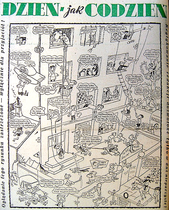 Tymczasem drugi pasek aż kipi od narracji graficznej, ale nie może być uznany za komiks, bo ma tylko jeden kadr. To jest właśnie ten tajemniczy "komiks jednokadrowy" (single panel strip), o który parę osób mnie pytało.