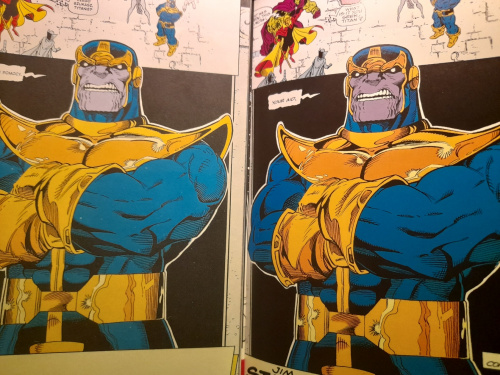 Skupiałem się na twarzy Thanosa i ogólnej kolorystyce i nie zwróciłem uwagi, że mi się dymek rozmazał :)