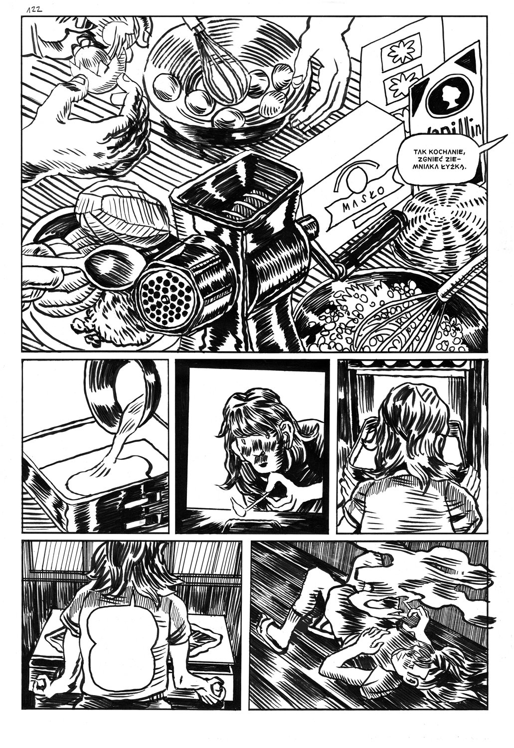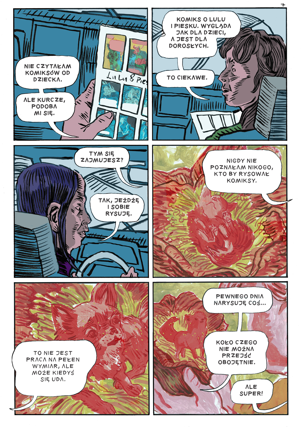 Czasem osoby zajmujące się komiksami robią zwrot w stronę malarstwa, bo być może malarstwo cieszy się w naszym społeczeństwie większym społecznym szacunkiem, kto wie. Ja miałem na studiach okres, w którym dużo malowałem, ale zawsze byłem gadułą, i próbowałem osadzić swoją pracę w jakimś kontekście. Z "Chłopakami" mam tak, że wiem, że jest tam kilka fajnych rysunków, które sprawdziłyby się w formie wielkiego muralu lub nadruku na t-shircie, a fabuła osadza te prace w kontekście, i nie muszę nic o nich mówić, bo cały mój autorski komentarz można poznać, czytając komiks. Ciekawe jest dla mnie, może nie tylko dla mnie, że dopiero publikacja "Słodkich Chłopaków" pozwoliła mi się pokazać w tzw. "polu sztuki", organizując wystawę w Galerii Komputer, na której pojawiły się komiksowe plansze i inne prace. Jednak to komiksy są językiem, którego jako twórca szukałem. Moje artystyczne ambicje to 4 kolejne komiksy, które mam w głowie. Niekoniecznie zależy mi na społecznym szacunku, ale mam wielką zajawkę na budowanie różnych opowieści. Czuję też odpowiedzialność, za to, co piszę, wobec osób czytelniczych. Ale też presję czasu, że czegoś nie zdążę, że się zestarzeję i zabraknie mi pary. Dlatego czuję konieczność napierdalania, póki mam na to wszystko siłę. Dużo różnych uczuć we mnie się rozgrywa wobec komiksów. Może to nie zabrzmi super pretensjonalnie, ale nie mam chyba teraz innego życia poza komiksami. Co u ciebie, Piotr? A, powolutku. Rysuję komiks, mam deadlajn. Na kiedy? Marzec 2023.