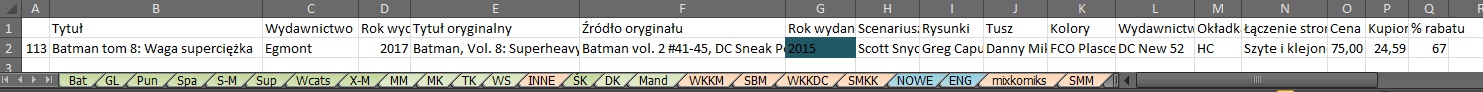 Jedno co bym u Ciebie zmienił, to zasadę formatowania kolumny "rabat", zobacz że jak wchodzi na minus, to znów pojawia się pełna kolorystyka, a w założeniu <0 to kolor czerwony. No i kwestia okładek - niejednokrotnie o tym myślałem żeby je załączać, ale nie znalazłem sensownej metody bez zmiany wysokości wierszy. Ze znanych mi metod tylko opcja ładowania okładek w komentarze by działała tak jak chcę (okładka pokazująca się po najechaniu kursorem na tytuł pozycji), uzupełnianie w ten sposób wymaga jednak sporo czasu...