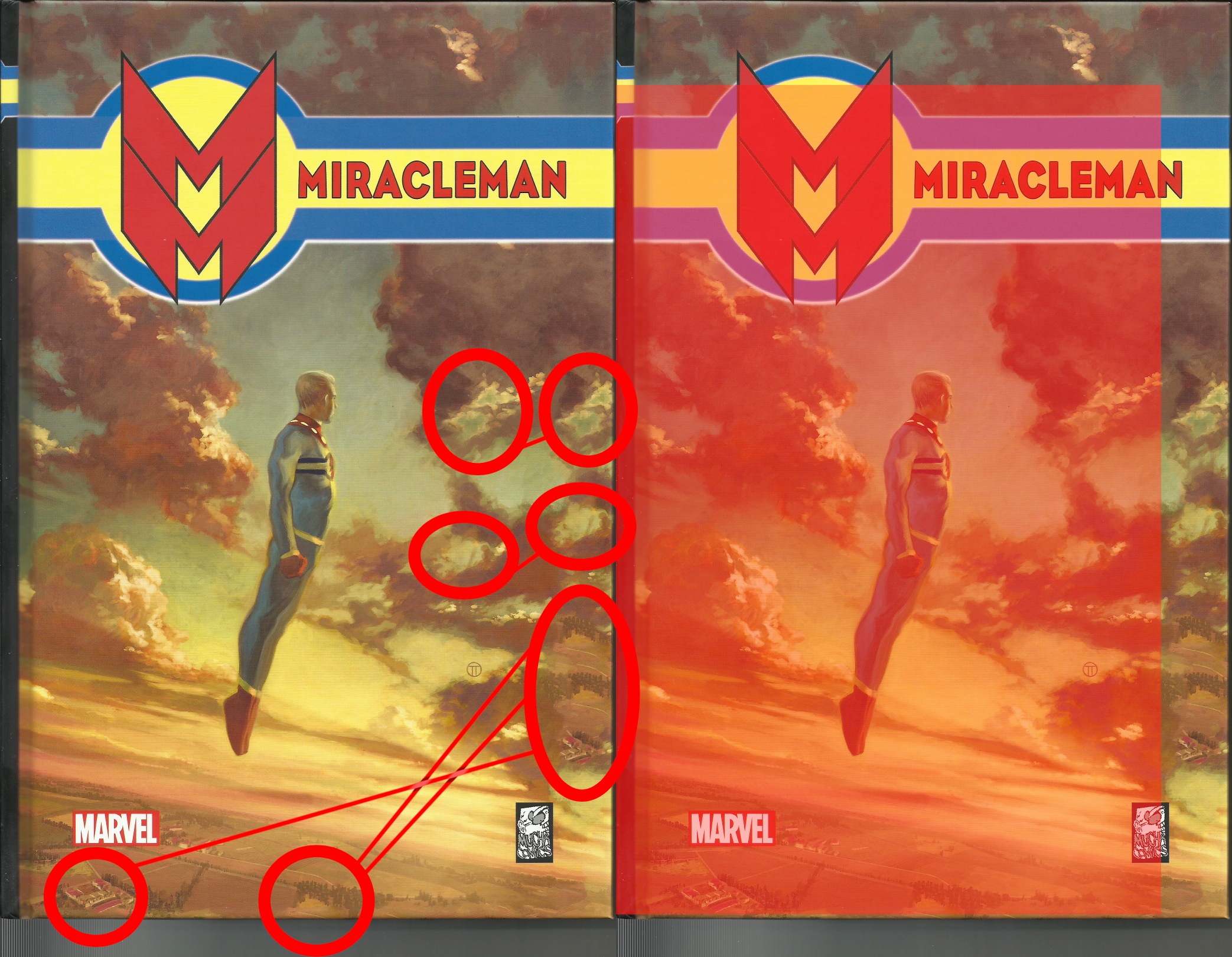Znalazłem oryginalną ilustrację (okładka Miracleman wyd. 2014 nr 6 wariant J. Tedesco) i obejmuje ona tylko część naszej okładki oznaczoną po prawej kolorem czerwonym, czyli cała górna i prawa krawędź są skopiowanymi fragmentami tego co występuje w innych miejscach oryginalnej okładki, na chmurach na górnej krawędzi nie rzuca się to w oczy, ale na krawędzi prawej....