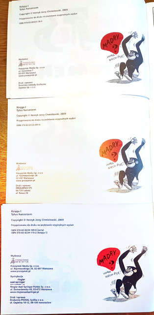 Żeby była jasność, uwaga dotyczy wydań Prószyńskiego z lat 2009-2024, które w stopkach redakcyjnych nie miały ani numeru, ani roku, nic. Oto trzy takie wydania: