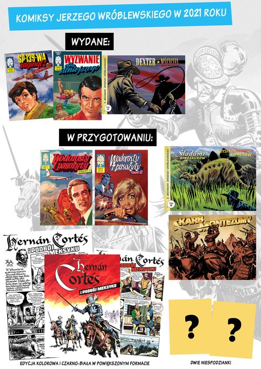 Fanów Mistrza z pewnością najbardziej ucieszy nowa edycja albumu „Hernan Cortes i podbój Meksyku”. Ten doskonały komiks planujemy wydać w dwóch wersjach: kolorowej w formacie A4 oraz czarno-białej w formacie zbliżonym do A3 – dokładnie takim, w jakim narysował plansze Jerzy Wróblewski.