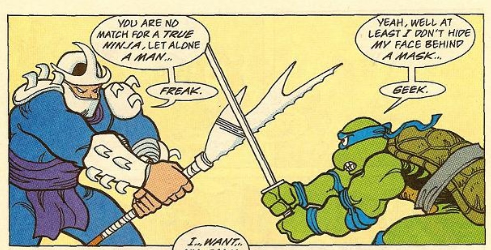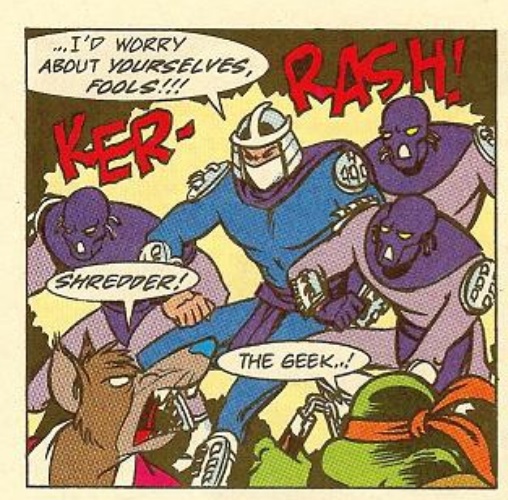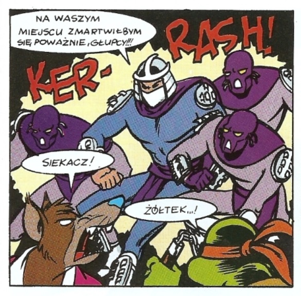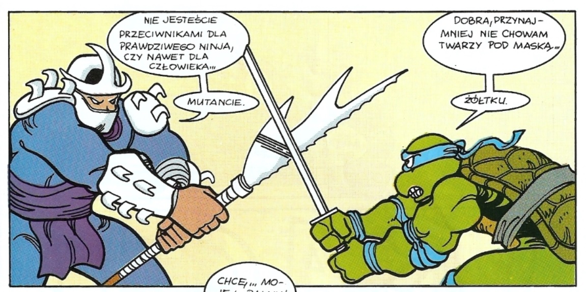 Dzięki, czyli "case closed". Jeśli chodzi o moją pamięć to jakoś mi się skojarzyło że on to mówi do jakiegoś zbira bez maski, ale to po prostu było to. Jednak na plus poczytuję sobie to że nazwał żółw tę osobę "żółtkiem" dwa razy" i że dobrze pamiętałem że - choć minęło prawie 30 lat - za drugim razem powiedział "żółtku" :-) Jeszcze raz dzięki :-) Ładnie nazywali rodaka swojego mistrza Splintera (w dodatku stał tam między nimi!WTF???), prawda? :-) Coś mi tu śmierdzi "ingerencją" tłumacza...ale trzeba by to kiedyś "wyśledzić" w oryginale, a to przecież pewnie był komiks z bardzo popularnej serii "Turtles No Ones Give a S..t!" ;-D jeśli wiesz o co mi chodzi ;-D
