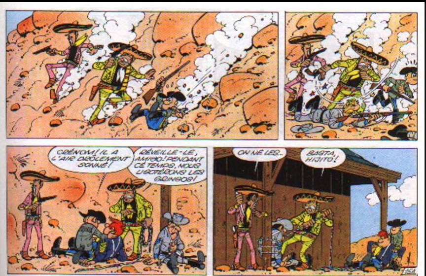- bohaterami byli chyba Meksykańcy (nie jestem pewien), trochę kojarzą mi się z daltonami (też może mi się zdawać), a akcja chyba działa się jakoś w czasach wojny secesyjnej, albo coś około, bo chyba byli tam żołnierze z tego okresu, ale mogę się mylić, możliwe też, że sami bohaterowie byli dezerterami?