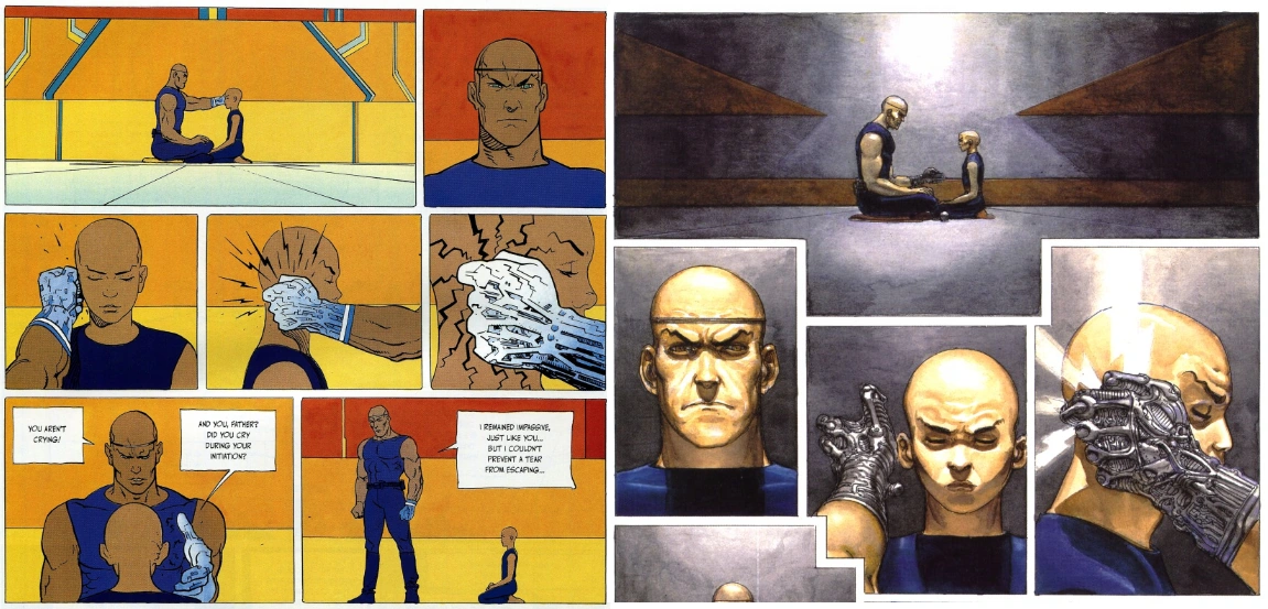 W tym kontekście zawsze mi przychodzi do głowy pierwsze osiem plansz "Prapradziada Othona" (pierwszego tomu "Kasty Metabaronów") narysowanych pierwotnie przez Moebiusa, a potem narysowanych ponownie przez Gimeneza. Kiedyś można było znaleźć w sieci te plansze, porównać je sobie i samemu ocenić czy któremuś rysownikowi wyszło lepiej, a jeśli tak to któremu. Teraz znalazłem jedynie część pierwszej planszy: