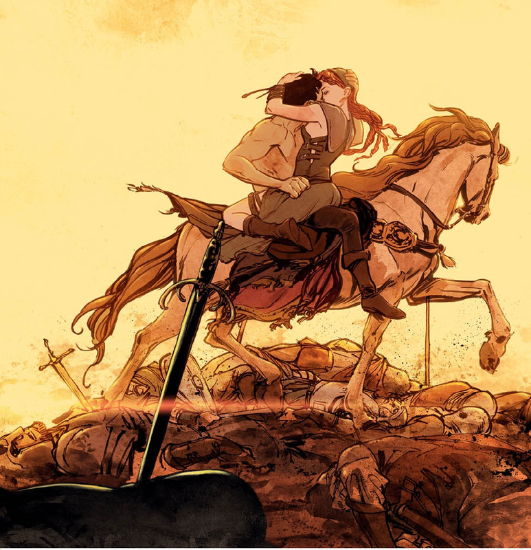 Oni całują się siedząc na koniu który kroczy po zwłokach poległych rycerzy.