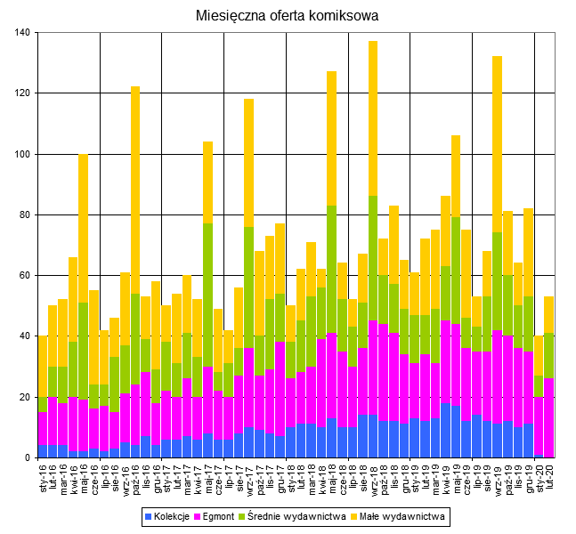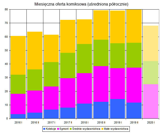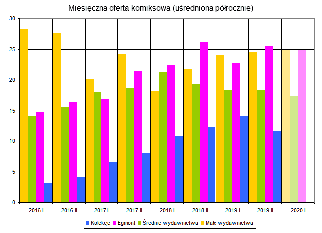 Druga połowa 2019 r. to zupełne wygaszenie kolekcji kioskowych. No i teraz pojawia się pytanie: jak będzie wyglądał krajobraz po kolekcjach? Czy ktoś zagospodaruje zwolnioną w ten sposób lukę? Na razie nic na to nie wskazuje, Egmont utrzymuje tempo 25 tytułów miesięcznie, średni wydawcy też nie szaleją. Niepokojąco słabo wyglądają wyniki za styczeń i luty br., ale to nie musi świadczyć o zapaści, tylko o tym, że na Aleję nie spłynęły jeszcze kompletne dane. Dlatego prognoza na ostatnim słupku (jaśniejszym kolorem) to zwykłe powtórzenie trendów z 2019 r.