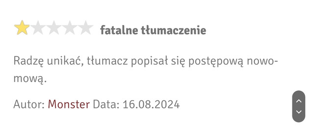 A dla mnie dopóki faktycznie tłumaczenie nie wypacza fabuły, a tutaj ni rybka to nie zmienia to mam absolutnie gdzieś jakiego słowa by użyli - no powiedzcie co to zmienia wam w życiu? Po co być tym zatwardziałym dziadek któremu przeszkadzają zmiany językowe? Weźcie sobie do ręki książkę sprzed nawet 200 lat - język tam też jest inny, pewnie tamci ludzie też mówili na nasz język, że po co to komu itp.