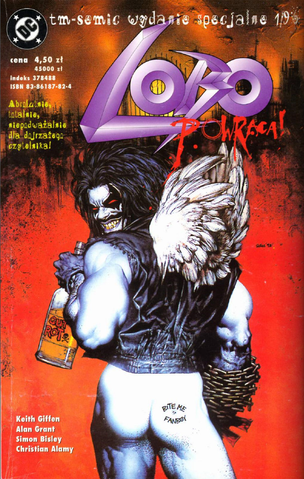 Ta druga to zupelnie inne wydanie - zwroc uwage na tytul to "Lobo's Back's Back!" a nie "Lobo's Back". Okladka to tzw. die-cut czyli niebieskie tlo i spodnie to zewnetrzna okladka z wycietym ksztaltem na Lobo, pod spodem po otwarciu jest "stara" okladka z golym tylkiem. Nie mam niestety tego wydania wiec nie moge pokazac.