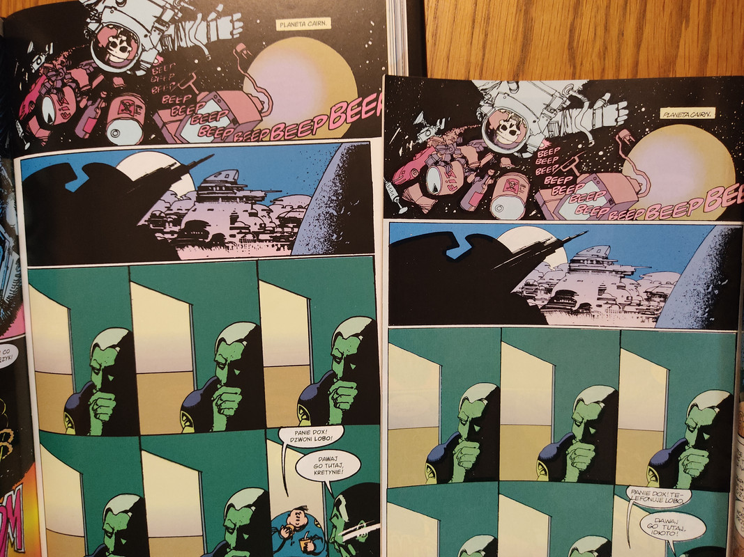 Dzięki też za wstawienie foto, widać problem Fun Media z separacją - np. po prawej na foto, kadr drugi od góry gdzie niebo graniczy z czernią, czyli wygląda jakby niebieski tusz celowo wchodził na czerń, pewnie jakby czerń szła na końcu to nie byłoby widać. O tej grubości linii czy też "skalowaniu" też już nie trzeba pisać, myślę nawet mało wprawne oko wychwyci że coś jest nie w porządku z nowym wydaniem (po lewej na foto).