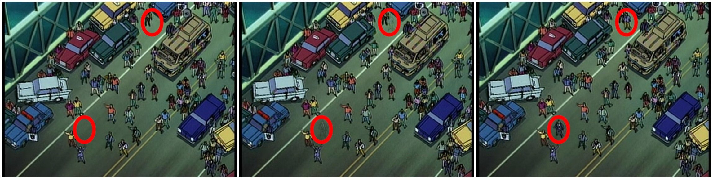 W kontekście wątku nowej komiksowej kontynuacji animowanego Spider-Mana z 1994 roku - tak w formie "telewizji" w tle włączyłem serial i po kilku odcinkach myślę odnośnie stylu i jakości animacji, bo jakość jest po latach bardzo krytykowana, kiedy ja patrząc jednym okiem niewiele mam jej do zarzucenia... Niestety ledwo co się przyjrzałem i taki kwiatek - trzy kolejne klatki, punkt widzenia przybliża się do tłumu i wówczas używane do animowania oprogramowanie generuje nowe osoby między klatkami (takie ewidentnie były limitacje, tu liczba obiektów animowanych w klatce...)...