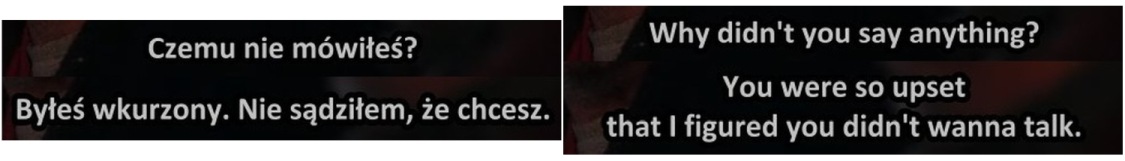 Wracając jeszcze do El Eternauta, z racji że w kilku miejscach nie zrozumiałem dialogu oglądając to wróciłem i miejscowo porównałem napisy, oczywiście te angielskie zdają się też być dosyć luźnym tłumaczeniem, ale miejscami te polskie kompletnie gubią sens. Przykładowo tutaj - dialog między postaciami, główny bohater rozmawia z postacią epizodyczną z którą był razem w armii, osoba straciła nogę i nie radziła sobie z życiem, spotykają się w tej nowej rzeczywistości i główny bohater pyta dlaczego ten drugi nie przyszedł porozmawiać (poprosić o pomoc), na co odpowiedź, że nie przyszedł, bo uważał, że główny bohater rozmawiać nie będzie chciał. Po polsku w "Nie sądziłem, że chcesz" kompletnie nie wiadomo o co chodzi - "chcesz" co? Zwłaszcza że to cały dialog dotyczący tego tematu...