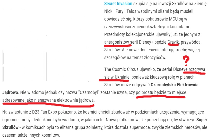 Jeśli MCU ma przestać być (szkoda że nie wparaduje teraz tu Deadpool; jakby ów śmieszkowy najemnik Marvela zrobił by sobie wbitę nagle do jakiegoś filmu MCU i zrobił porządek z tym Multiświatem, tak jak zrobił porządek w komiksie "Deadpool Kills the Marvel Universe", to by się wreszcie to pierdololo skończyło.  ;D) słodziutkie, lukrowane pastelami i kolorami Disney'a - bo przecież musi się sprzedać! - to jedyna nadzieja na taką zmianę być może, i oby to nie był efekt krótkotrwały, leży w "Tajna Inwazja", serialu, który za dwa miesiące zadebiutuje na Disney+. Zwiastun dedykowanej na platformę streamingową Disneya produkcji, zarówno ten pierwszy i ostatni, robią według mnie kapitalne do potęgi entej wrażenie. I to wrażenie na chyba każdym dorosłym i świadomym widzu, który ceni sobie MCU, ale oczekuje czegoś odważniejszego, bardziej przyziemnego, ciernistego i zawadiackiego! Kilkadziesiąt sekund zwiastuna mrożących krew w żyłach pod względem podstępnie tajemniczego, chłodnego i cieknącego realizmem rzeczywistości klimatu i atmosfery, w którym prezentacja założeń serialu, który prawdopodobnie da nam coś czego w MCU jeszcze nie było, wyszła fantastycznie! "Tajna Inwazja" będzie, co podejrzewam, połączeniem klimatu, atmosfery i motywów z cyklu filmów "Tożsamości Bourne'a" z filmem "Eagle Eye", "Jack Ryan" etc. Sami sobie odpowiecie, z czym ten serial się wiąże. To nie będzie ,,źle uważony bigos"! Damn it!