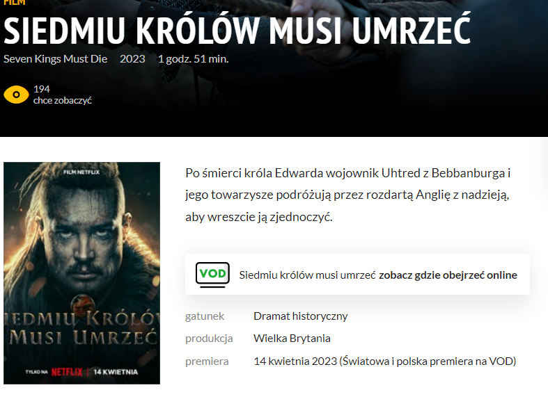 Film zapowiada się dość dobrze, ale to czy będzie ,,epicko", okaże się po jego seansie, po netflixowej emisji pt. "Siedmiu królów musi umrzeć". Mimo wszystko to nie serial, więc rozwój wydarzeń, rozciągnięcie wątków, fabuły, samo zwieńczenie historii, które prezentowano w serialu "Upadek Królestwa" będzie wyglądać w wielu aspektach inaczej w tym filmie w stosunku do serii odcinków w sezonie. Jakaś ,,podjarka" jest!  8)