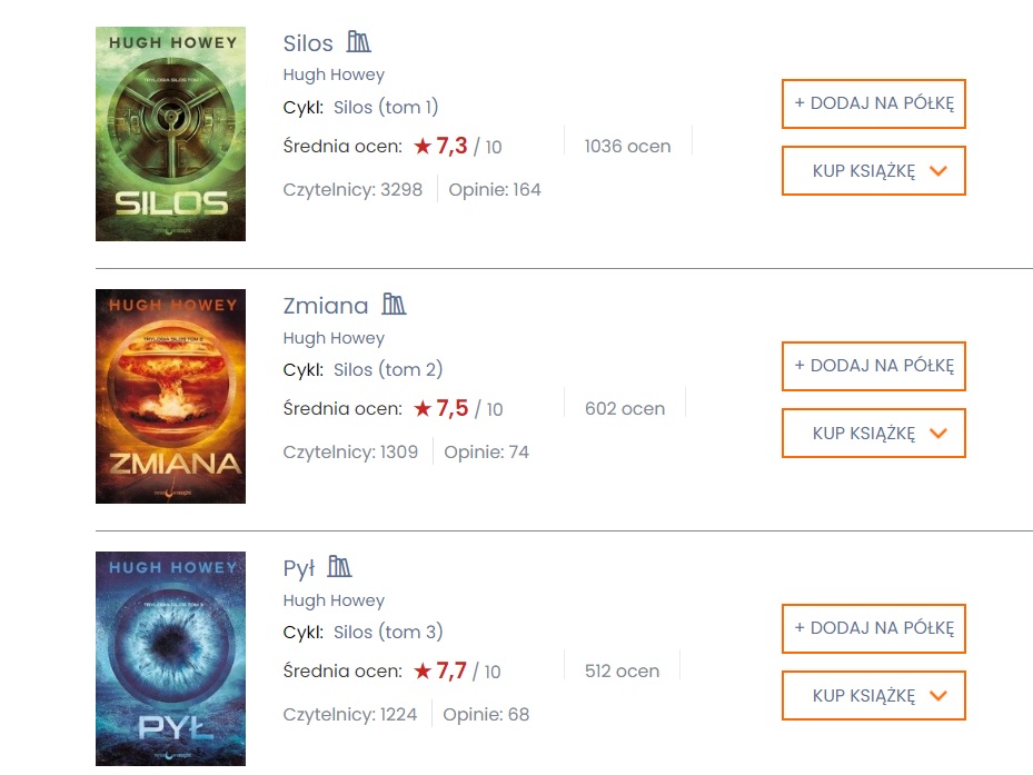Jeśli jest, to... kurnia balansik, jeśli ów serialowy "Silos" nie będzie bardzo okrojoną adaptacją powieści, to czeka nas świetna seria odcinkowa, albo i dwie, jeśli produkcja dostanie przedłużenie na kolejne sezony. Dlaczego świetna? Przeczytałem całą trylogię - postaci, wątki, podejście do tematu post-apo, sposób zaprojektowania Świata Silosu, jego społeczności, struktur władzy etc., wszystko to na co najmniej bardzo dobrym poziomie!