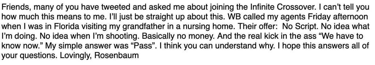 Aktor się nie wybił. Jego największa rola, Lex Luthor na małym ekranie, w mającym wiele problemów serialu, miała miejsce jakąś dekadę temu. I nagle ktoś sobie w CW pomyślał, że od biedy weźmiemy tego gościa do Kryzysu, będzie fajny smaczek. Ten stary Robin się zgodził, ten stary Flash też jest na zawołanie, to Rosenbaum będzie zachwycony. I co? Przypadkiem się złożyło, że jak zadzwonili do jego agenta, to akurat był przy schorowanym dziadku. Czasu mało, to stacja chciała wiedzieć czy może na niego liczyć, więc prosiła o szybką decyzję. A ten oczywiście obrażony. Wątpię by jakiemuś aktorowi na starcie zdradzali szczegóły realizacyjne, gdy ten jeszcze nie jest w 100% dograny. I wszystko byłoby ok, gdyby nie to, że Rosenbaum napisał posta w sposób, który zwala winę za jego nieobecność w serialu na złą wytwórnię. Mógł to lepiej rozegrać, a nie publicznie wylewać żale.