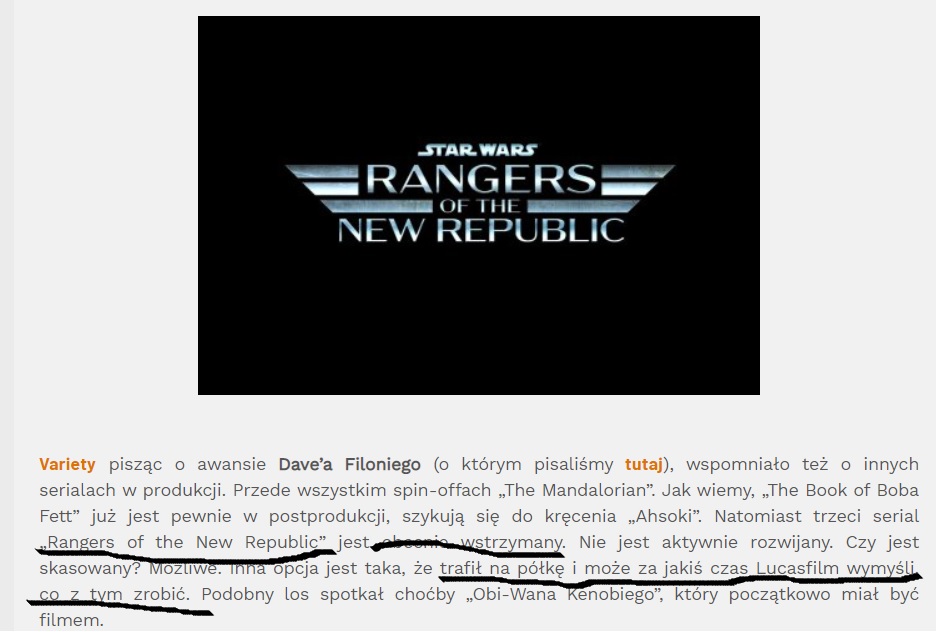 Jak widać powyżej, takie oto info nam przekazano z rodzimego bastionu gwiezdnowojennego; to miał być ,,topowy serial", nowokanoniczny twór ze stajni Star Wars. Możliwe, że dojdzie do tego, że... nie dostaniemy połowy tego, co kilka miesięcy temu zapowiadało "Lucasfilm Ltd.". Zobaczymy, jak to wszystko się z czasem rozwinie. Może pani Kennedy planuje ,,coś przepchnąć" z jakiejś pełnometrażówki w miejsce "Rangers of the New Republic". A coś ploty idą zza oceanu, że firma zastanawia się nad zmianą Kanonu, dodaniem nowego, albo restartem Uniwersum Star Wars; coś w każdym razie dziać się będzie.  8)