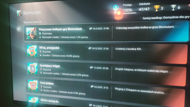 Poza tym, ukończyłem (10/04/2023) w 100%, czyli przypadło mi zdobycie Platyny na PSN, grę "Biomutant" w wersji na Ps5. Tytuł kupiłem gdzieś w sklepie internetowym w ,,pudełku", w wersji polskiej, na nextgena. I tak, całościowe przejście gry i jej ,,oplatynowanie" zajęło mi 45 h 27 min. 13 sekund. I tak, mam świadomość, że to było za długo, ale do ,,Platyny" specjalnie się nie przygotowywałem, nie robiłem jakichś speedrunów, rzadko korzystałem z poradników z YT i tym podobnych, choć zdarzało mi się takowe ,,oszustwo". Gaming miał być dla mnie przyjemny, a nie toporny i nużący - sesje ,,pogrywania" w Biomutant były krótkie: 1h/1,5h, góra co kilka dni, jak był na to czas. Nie rozkładając "Biomutant" na czynniki pierwsze, nie opisując wrażeń z płynności działania grafiki (z tym było bardzo różnie na nextgenowej opcji gry i odtwarzaniu jej na OLEDzie średniowysokiej standaryzacji) i mechaniki rozgrywki, dodam jedynie tyle: to była udana gra, bardziej śmieszna, niżeli poważna. Jej świat dla gracza był caaaałkiem spory. Liczne kopytne, dziwnie nazywające się stwory, które trzeba było oswoić i gadżety mechaniczne, oraz jeden balon do latania i jakieś inne ustrojstwa pozwalały na w miarę szybkie przemieszczanie się po mapach. Co ciekawe, a dodam tylko tyle w tej kwestii: punkty szybkiej podróży, aby działały i gracz mógł się gdzieś przemieścić, musiały wcześniej zostać przez główną postać gry... obsikane. Tak... obsikane! Bo w ten sposób ,,oznaczało się" teren. Post-apo okazało się tym elementem świata przedstawionego, który był zbyt naiwny i ,,miękki".