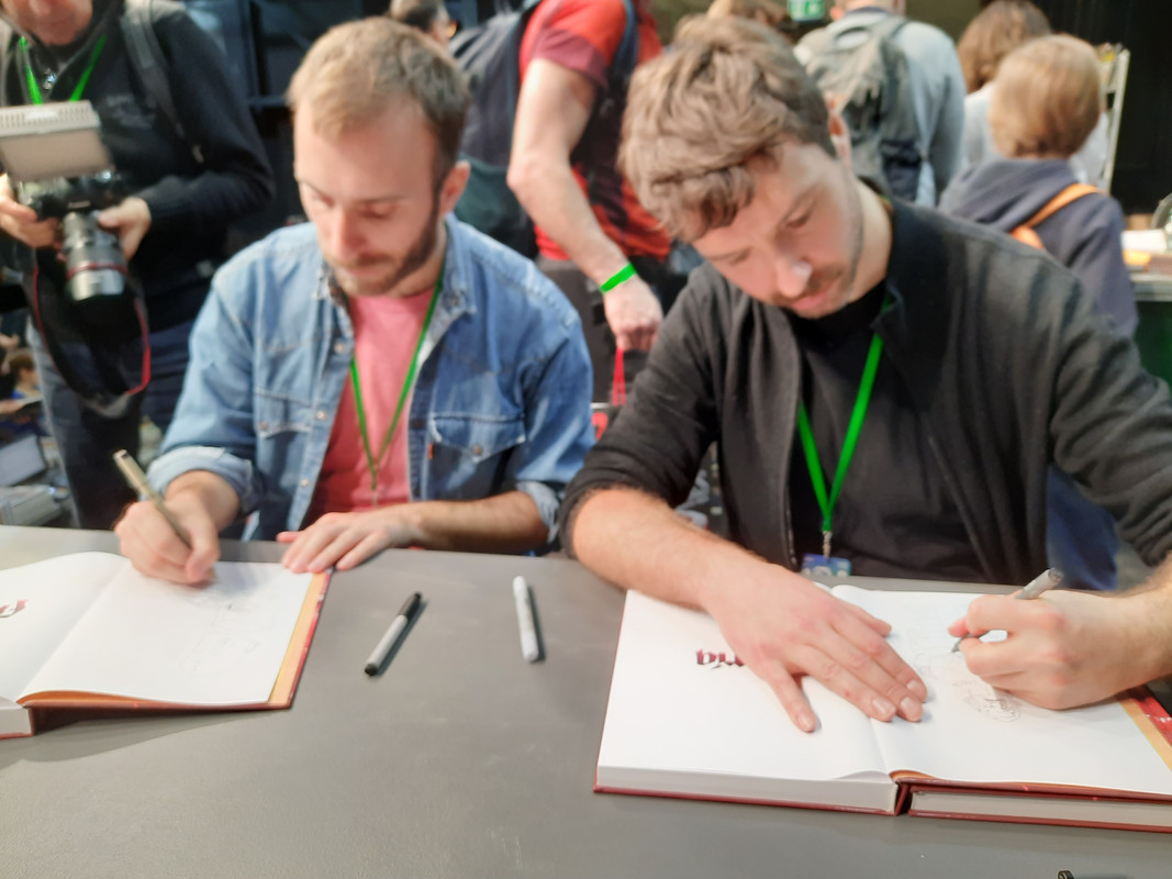 Geoffroy Monde (scenarzysta, ale narysował Ysę) i Mathieu Burniat (rysownik - narysował Szatana) w "Furii" (podczas rysowania Geoffroy zwrócił uwagę na niekończący się sześciopak szatana w wykonaniu Mathieu a śmieszkom nie było końca :D) :