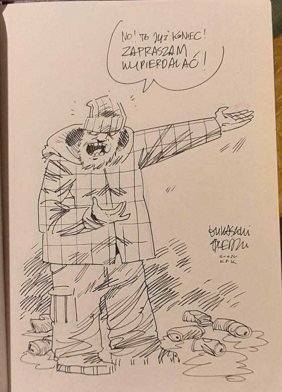 Mam identyczny, a byłem przed Tobą. Zanim zaczął rysować mój rysunek, wku..ła go żona, która zrobiła mu scenę, że nie zgadza się na to, żeby został dłużej i rysował. Ale tak, jak napisałeś, jestem bardzo dumny, że mam rysunek i autograf od takiej legendy.