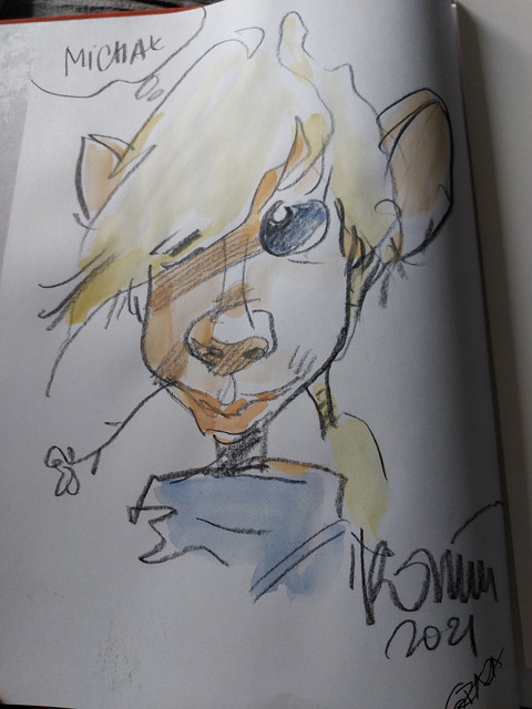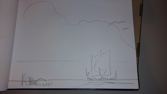 Za drugim razem (lub trzecim, nie pamiętam już dokładnie), czyli na kolejnej emefce, przeglądał dokonane już wrysy, a bylo ich trochę. I znowu mówił, że nie może, nie powinien. I gdy tak mówił to doszedł do pierwszej wolnej strony i zaczął rysować drakkara na morzu... Mi szczena opadła. A GR dalej mówi, jak to nie powinien, aż skończył rysować. Ja w szoku podziękowałem i w skowronkach zrobiłem miejsce kolejnym kolejkowiczom.