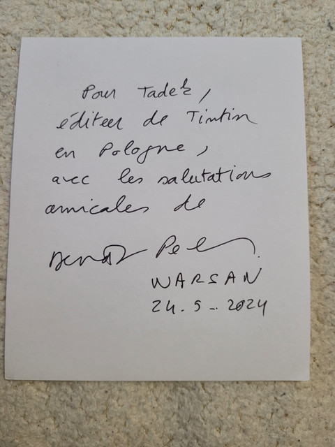 Autograf od Benoita Peetersa - chciałem go dostać w jednej z jego książek o Tintinie, ale niestety przesyłka z eBaya się opóźniła i nie zdążyłem jej odebrać przed wyjazdem - na szczęście autor był na tyle miły, że podpisał mi się na kartce, którą sobie wkleję do książki: