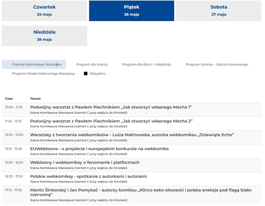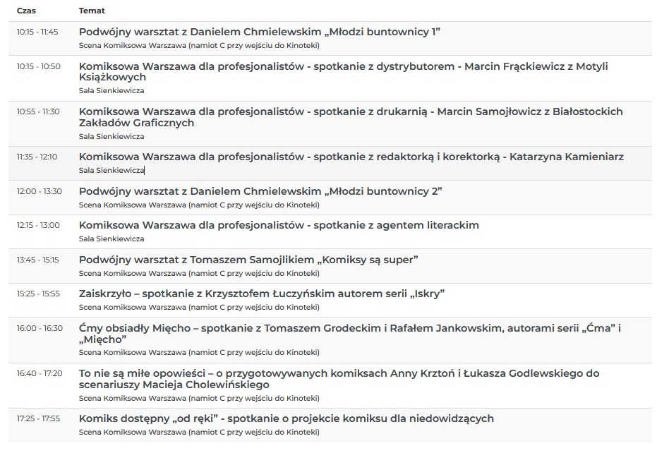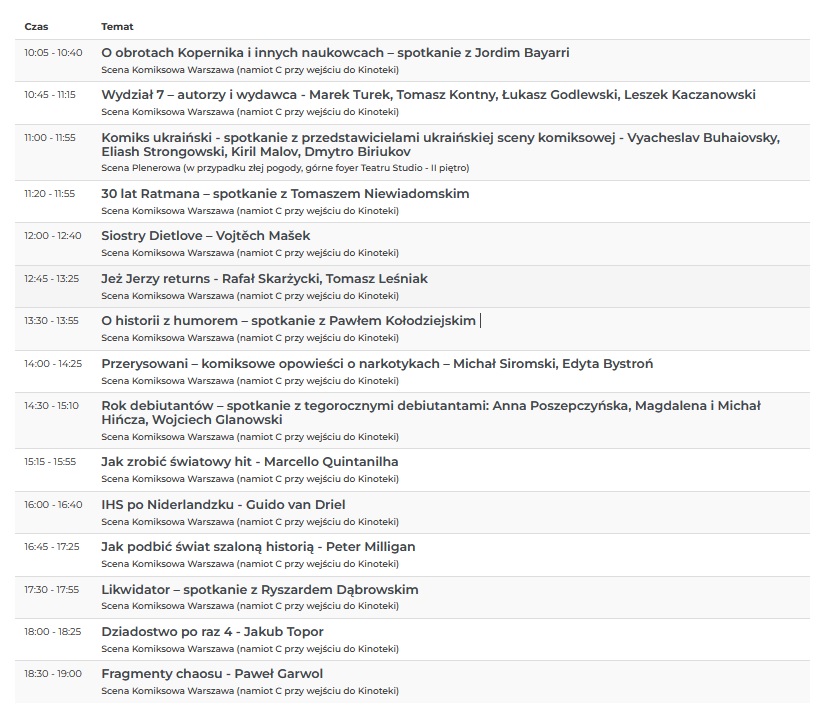 Tabela powstała na podstawie informacji o gościach festiwalu z facebooka Komiksowej Warszawy (i powyższej rozpiski strefy autografów).