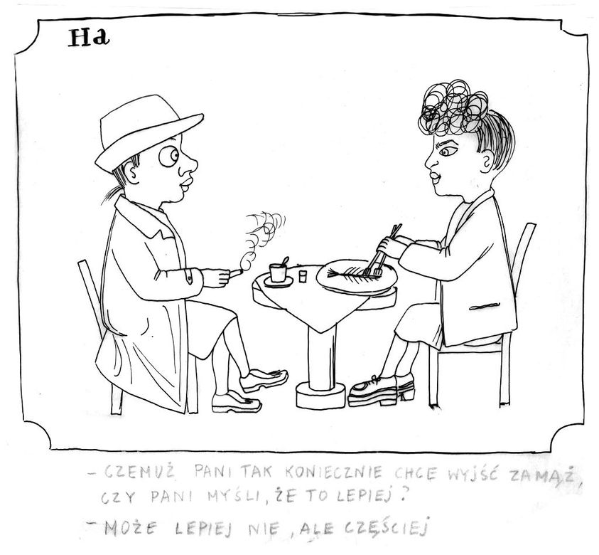 Poniżej autokarykatura Ha-Gi z Olgą Siemaszko opublikowana w "Szpilkach"