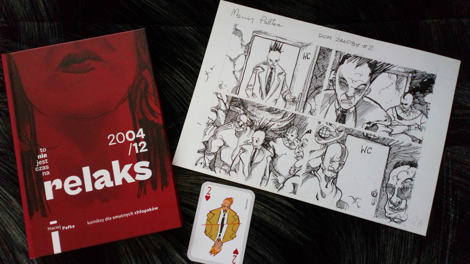 Zacznę z wysokiego P, jak Pałka :D. Na imprezie odebrałem swój egzemplarz "To nie jest czas na relaks" z planszą (a dokładniej półplanszą? :P) i kartą kolekcjonerską (dla zainteresowanych powiem, że na razie są 4 wzory - oprócz Pałki można dorwać też Ottoicha, Łobosa i "WU" Zielińskiego). Maciek, wykonał również wrys w komiksie.