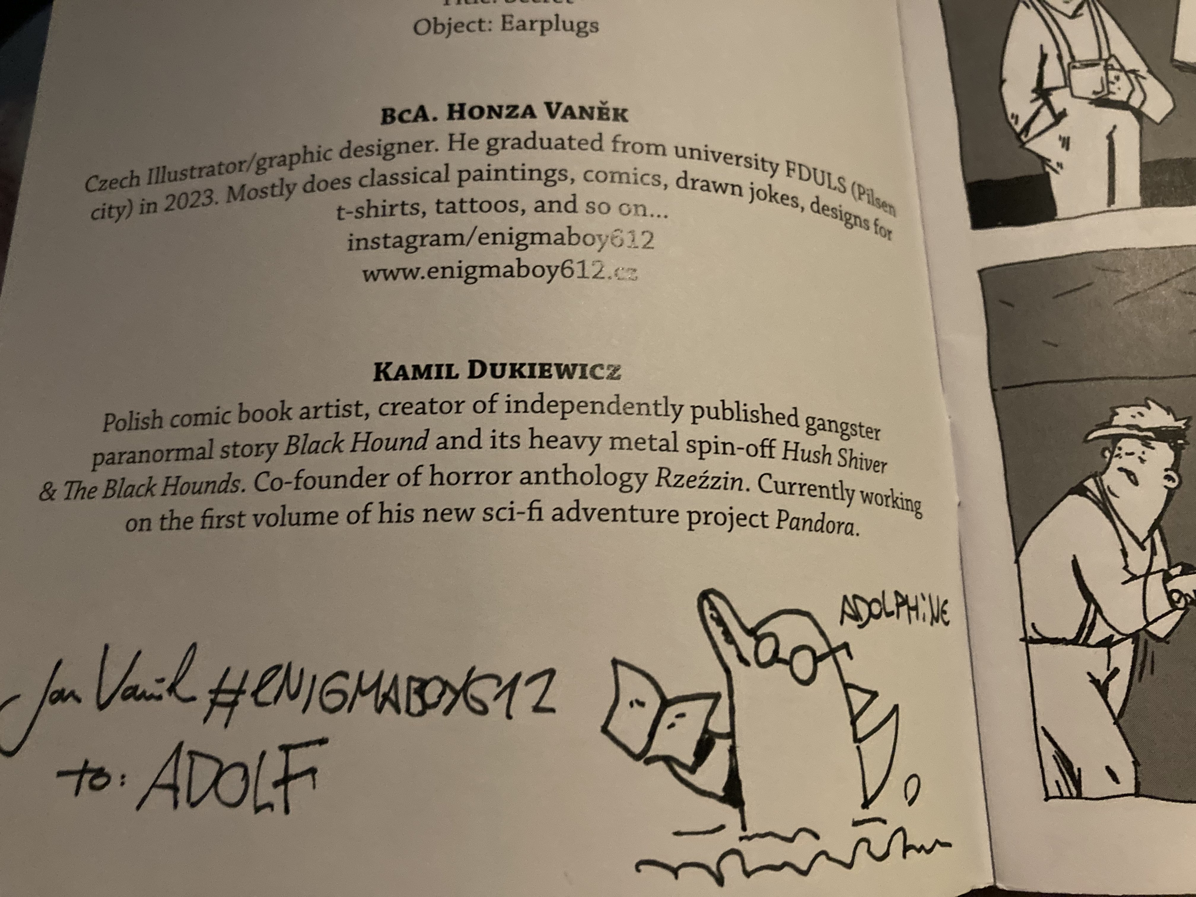 www.enigmaboy612.czhttps://www.instagram.com/enigmaboy612/„Secret” to zin Jana, który możecie otrzymać podczas festiwaluKačka Illnerová freshly finished art student from Czechia. My works are usually children oriented, be it books, magazines or festivals. And comics, of course. I do enjoy playing with the comics format. And I’ll never refuse to draw you a cat or a teapot.