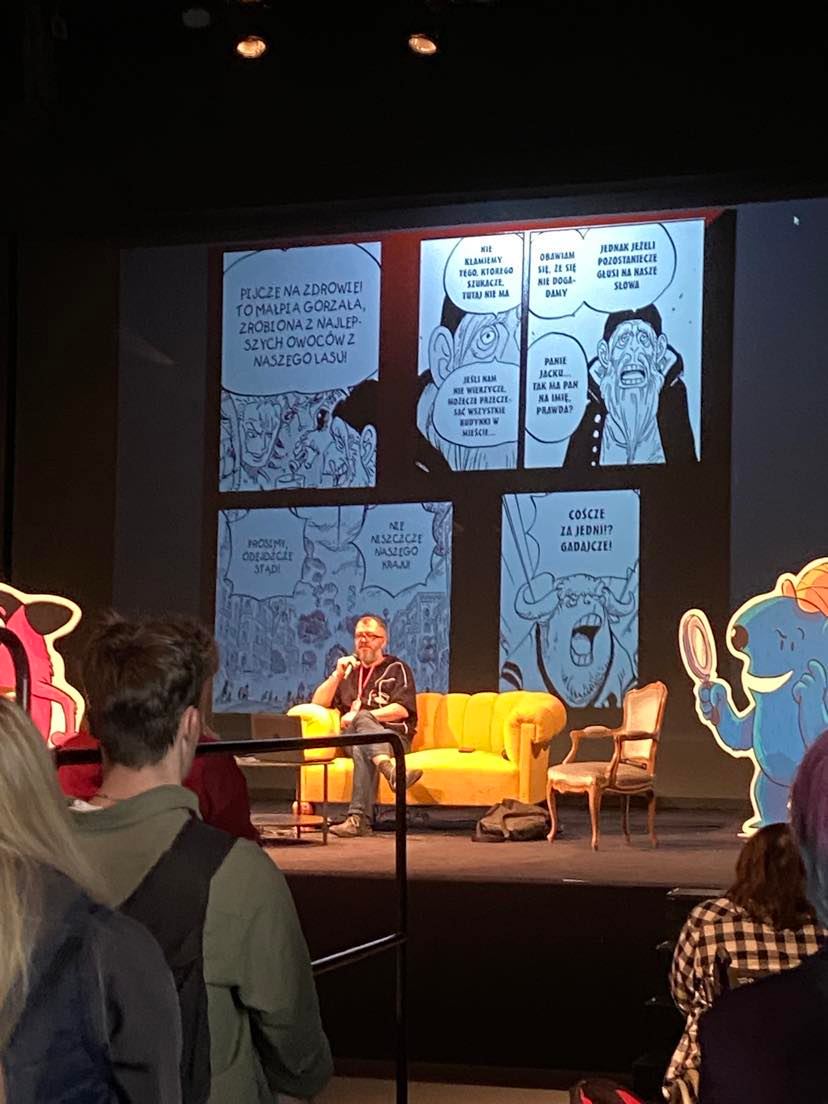Dzień drugi, tak ogólnie to głównie rozmowy z twórcami. Ale też wizyty na spotkaniach. Tu z tłumaczem mang oraz twórcami jeża Jerzego i misia Zbysia.