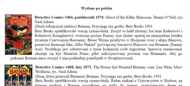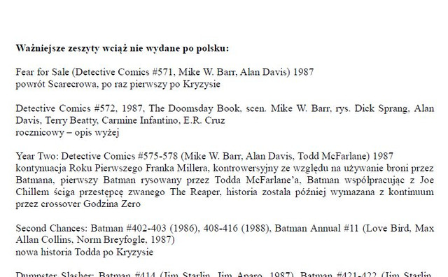 1. Lista jest przydatna głównie z tego względu, że Batman jest najbardziej rozproszoną serią wydawaną w Polsce. Spider-Man dostępny jest w wielu wydaniach zbiorczych a nie pojedynczych zeszytach, innych bohaterów ukazało się u nas znacznie mniej i łatwiej się w tym odnaleźć.