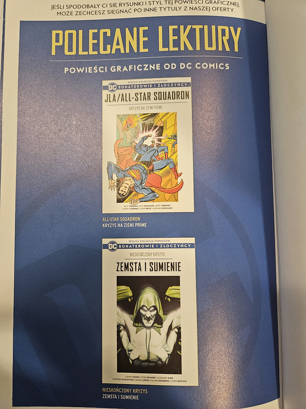 No właśnie o to chodzi, że go de facto nie ma  :(. Na stronie kolekcji w ogólnym spisie tomów ten album jest podpisany jako Infinite Crisis: Day of Venegeance, ale już na okładce mamy Infinite Crisis: Venegeance and Conscience (czyli nasze Zemsta i Sumienie) i zestaw zeszytów podlinkowany przez @Necr09 - JSA #73-76 i JLA #115-119. Tak więc mnie też wydaje się że na liście jest błąd i Dnia Zemsty nie dostaniemy  :(. Chociaż nie miałbym nic przeciwko, jeśli się pomylę.