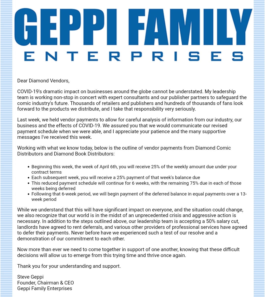 Please be aware that some of our discounts will not be quite as low as usual. These different distributors do not sell books for the same price as Diamond but we are keeping your cost as low as possible. Please let us know if you have any questions."