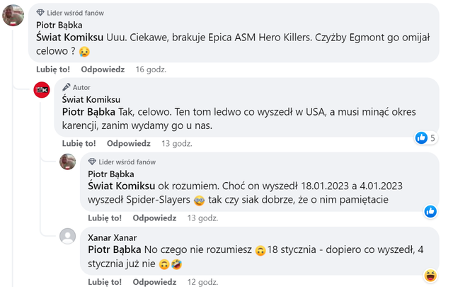 Chyba? On jest na amerykańskim rynku dłużej niż jakikolwiek epic na polskim. Za to nadal nie ma 16. tomu i osobiście myślę, że Egmont cofnie się do 15. dopiero wtedy, gdy będzie mógł wydać od razu po nim kolejny, ale zobaczymy, bo to jest przewidywanie zagmatwanego.