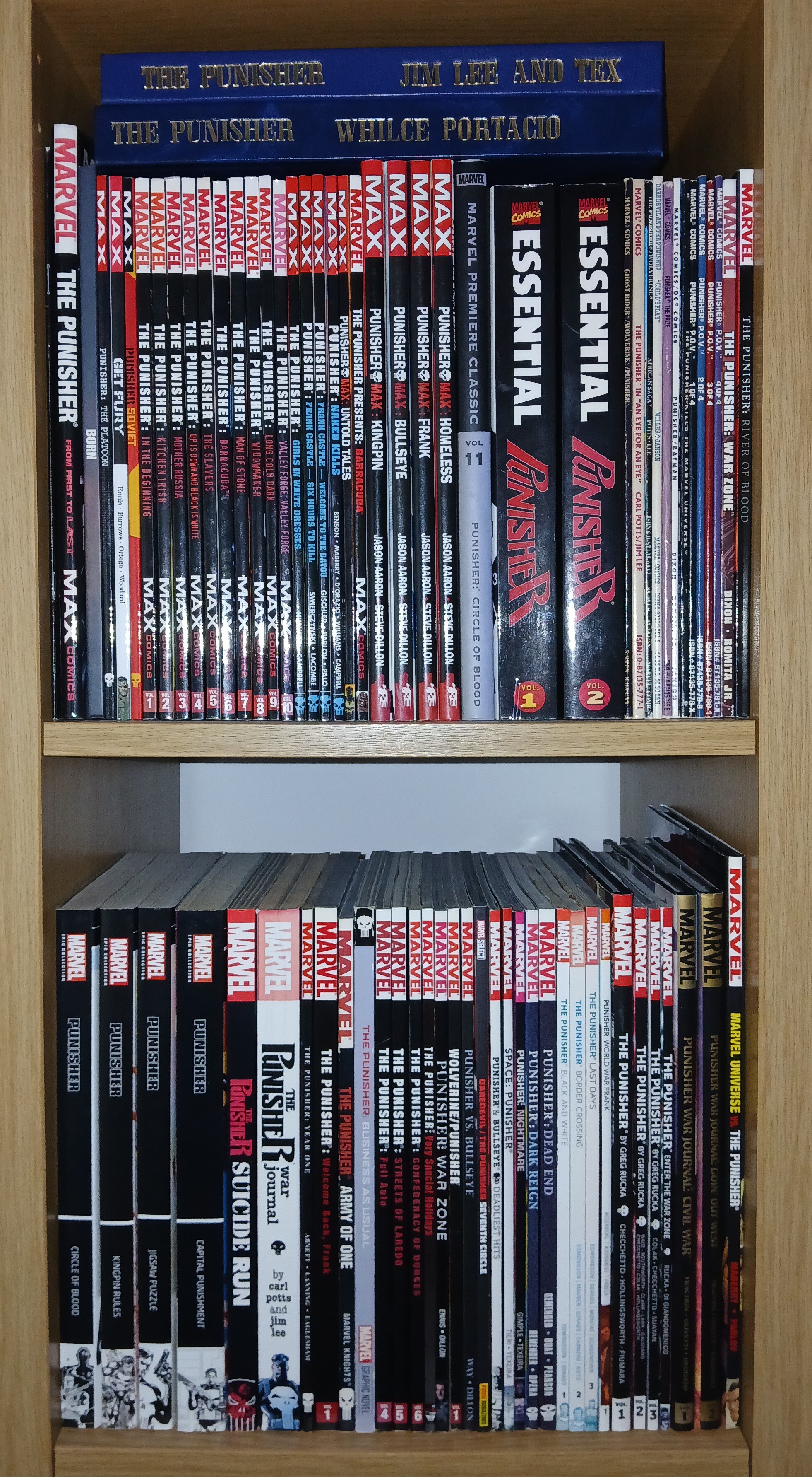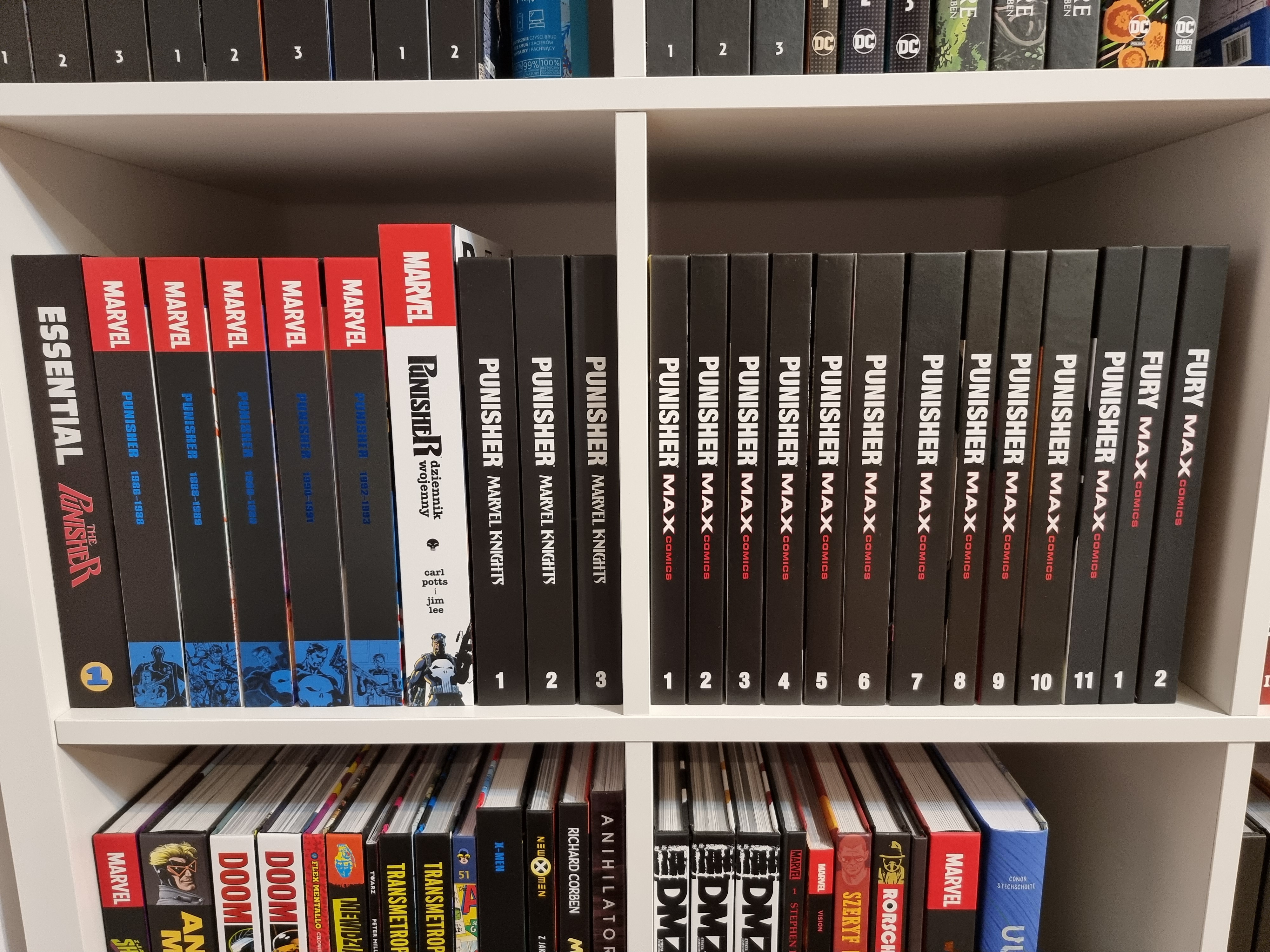 I na przykładzie tej półki widać jak egmont spier...... z tym War Journalem. Chcąc sobie poukładać chronologicznie, tak jak to zrobił kolega powyżej, mamy w środku "schody". Nie pasuje to ni cholery ani gabarytowo ani kolorystycznie do reszty grubasów z Punisherem. Nie mówiąc już o tym nieszczęsnym offsecie wewnątrz. Ciekawe kto konkretnie był taki mądry i zdecydował o takim a nie innym wydaniu? Dla mnie jedna z najpoważniejszych wtop wydawniczych tego roku. Przebija to nawet rozkładówki z Marvel Knights Spiderman czy brakujące strony w Ghost Riderze u konkurencji.