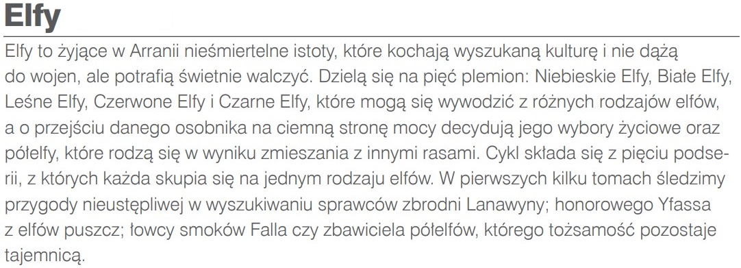 W skrócie: "Elfów" wyszło na tą chwilę (maj 2023) 35 tomów, Krasnoludów 26, Oig 21, Magów 9, o krainie Ogon 3, o krainie Arran 1.