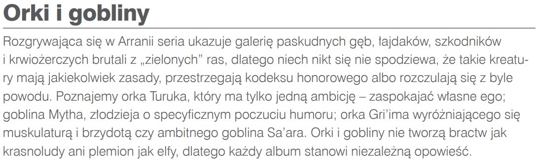Przez najbliższe miesiące w takiej właśnie formie przybliżane będą kolejne historie bractw krasnoludów oraz rodzajów elfów, później wydawnictwo uruchomi serie poświęcone orkom, goblinom i magom. Wg. informacji podanych przez wydawcę , cykl liczy już ponad osiemdziesiąt tomów. Nie znam koncepcji uniwersum, nie potrafię więc powiedzieć czy przedstawieni bohaterowie powrócą w przyszłości, czy też czytelnik raczony będzie dalszymi opowiadaniami. Życzyłbym sobie jakiegoś nadrzędnego wątku splatającego losy wprowadzanych stopniowo postaci. Luźne opowiastki z poszczególnych rejonów mapki, nie wydają się specjalnie zachęcające.