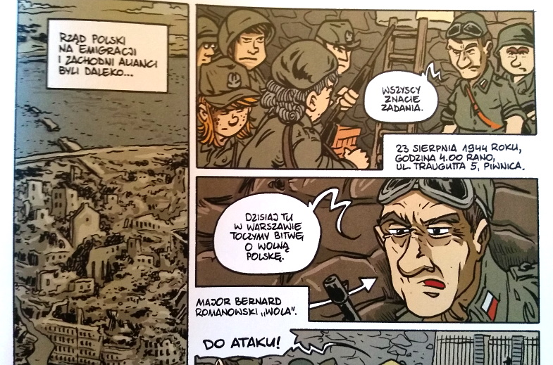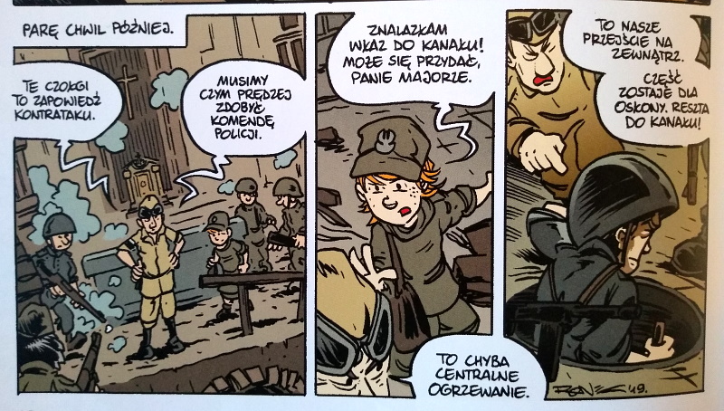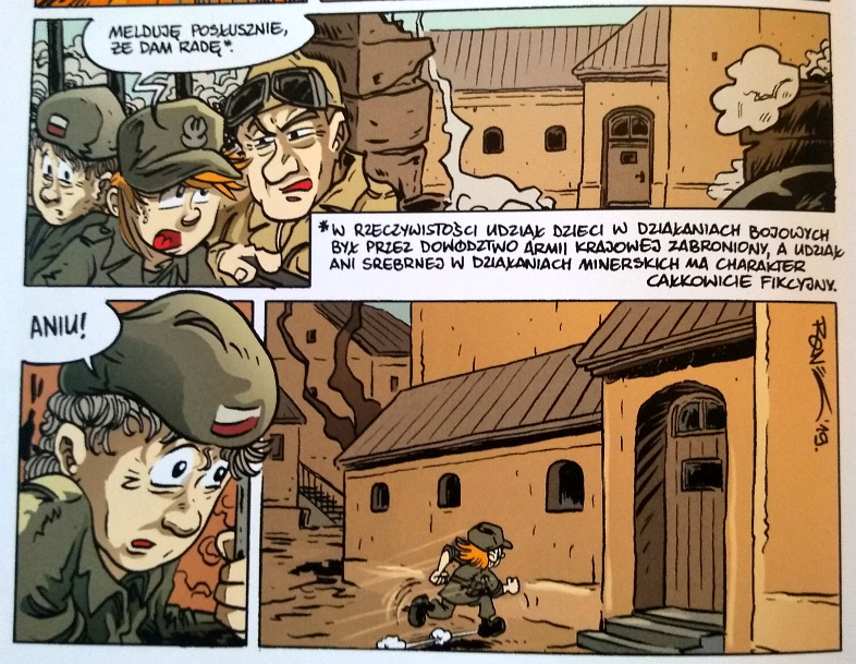 Idziemy dalej. Czytelnik już jest uświadomiony - wie, że AK zabraniało posyłać dzieci do powstania, ale pan dowódca, major "Wola" (czyli Bernard Romanowski, postać autentyczna) najwyraźniej tego nie wie i dalej trzyma Anię Srebrną w oddziale. Naprawdę dziwię się, że rodzina pana majora nie wytoczyła IPN-owi procesu, że w komiksie przedstawiono ich przodka jako żołnierza okrytego hańbą, ponieważ postępował wbrew rozkazom własnego dowództwa.
