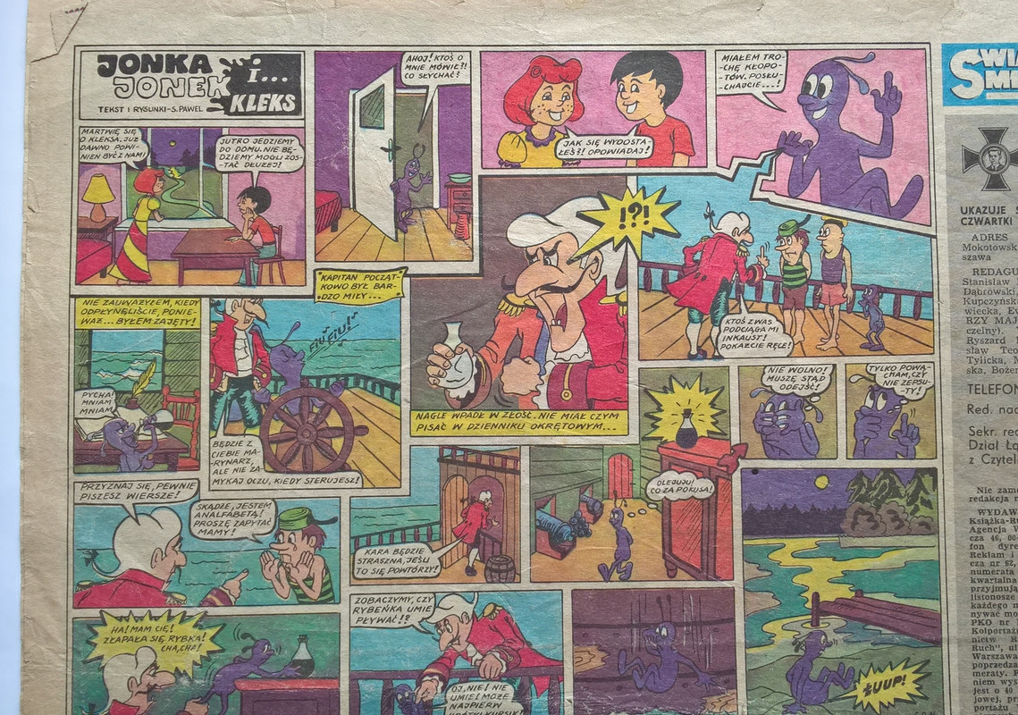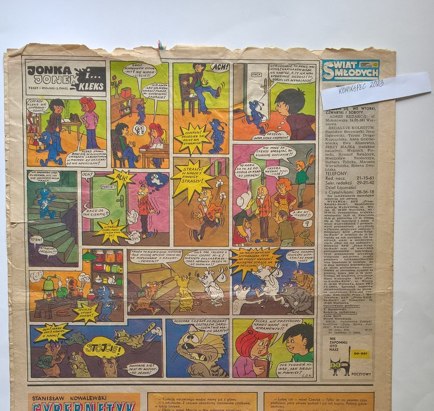 W kwestii samej grafiki, nie trzymamy się sztywnych ram i sam układ nieco się zmienia, w przypadku Szarloty Pawel zastosowaliśmy podział wg serii które stworzyła, a także nie mogliśmy się oprzeć, by dodać choćby rozdział poświęcony magazynowi "Uśmiech Numeru". Z którym zresztą była niezła zabawa, gdyż w końcu udało się zdobyć większość okładek, ale brakowało… jednej. Tomik ten ma Biblioteka Narodowa, wysłałem więc zamówienie reprograficzne, ale z powodu praw autorskich Biblioteka nie może niestety powielać i udostępniać takich materiałów. Ale można udać się osobiście i zrobić sobie we własnym zakresie skan lub zdjęcie. Do Warszawy mi nie po drodze, jednak znalazła się osoba, która udała się na takową misję, ukończoną na szczęście sukcesem! Szarlota Pawel zastosowała specyficzną, do tego bardzo urokliwą, czcionkę na tytuł "Jonka, Jonek i Kleks", niestety trudno znaleźć prawie identyczną, by sklecić w podobnej formie pozostałe nazwy. Koniec końców przerysowałem wszystkie literki, dorysowałem brakujące, i wszystkie tytuły są utrzymane w podobnym stylu. Co strasznie mnie cieszy.
