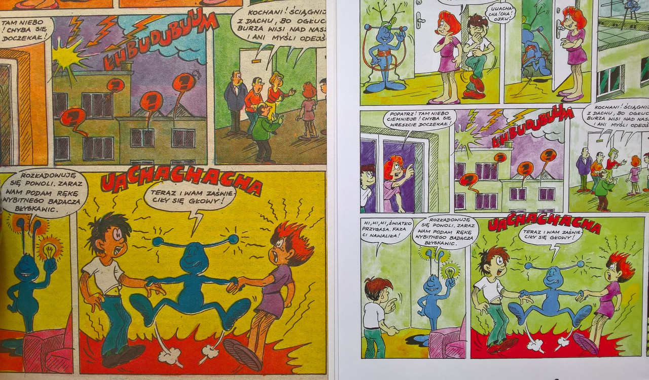 Ktoś mi wyjaśni o co chodzi z tym zielonym kolorem w wydaniu Egmontu? Żarówka świeci na zielono, wybuch jest zielony, itd.