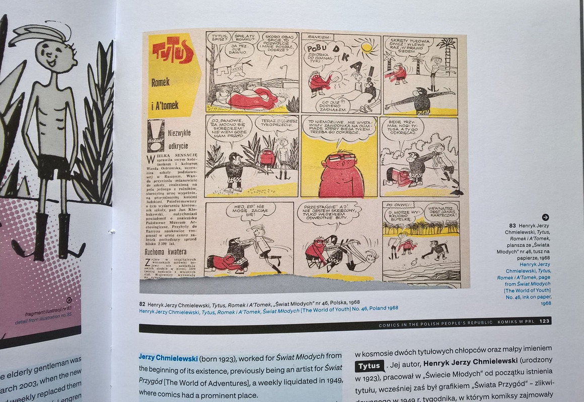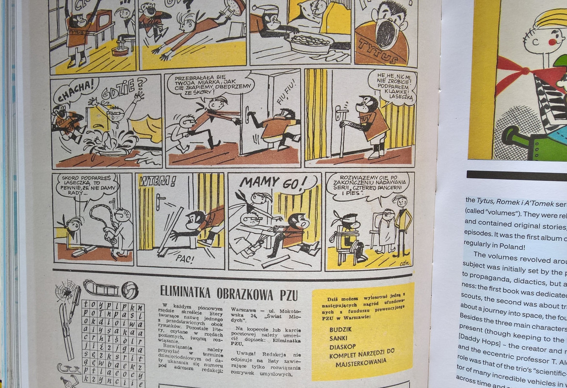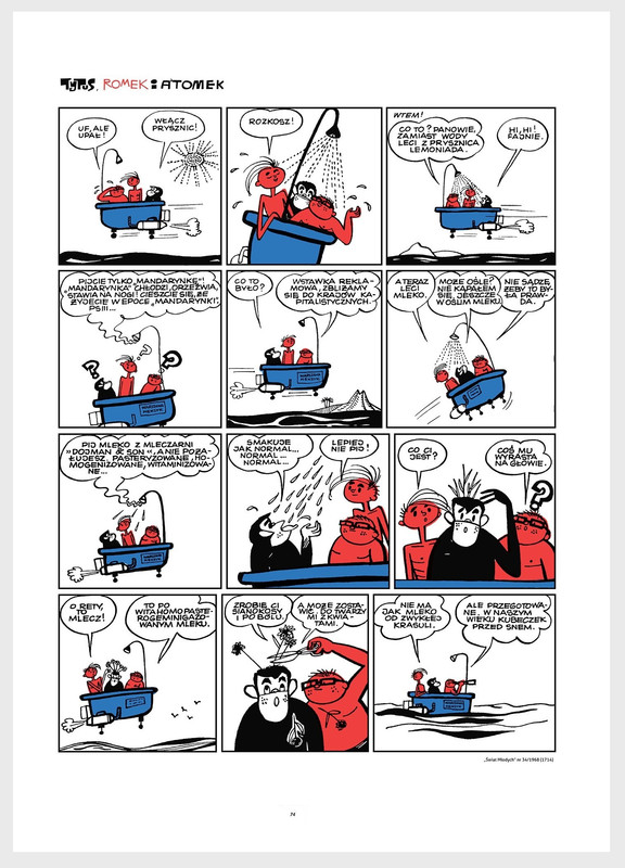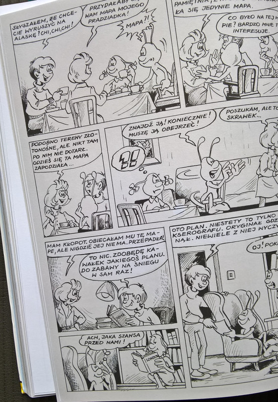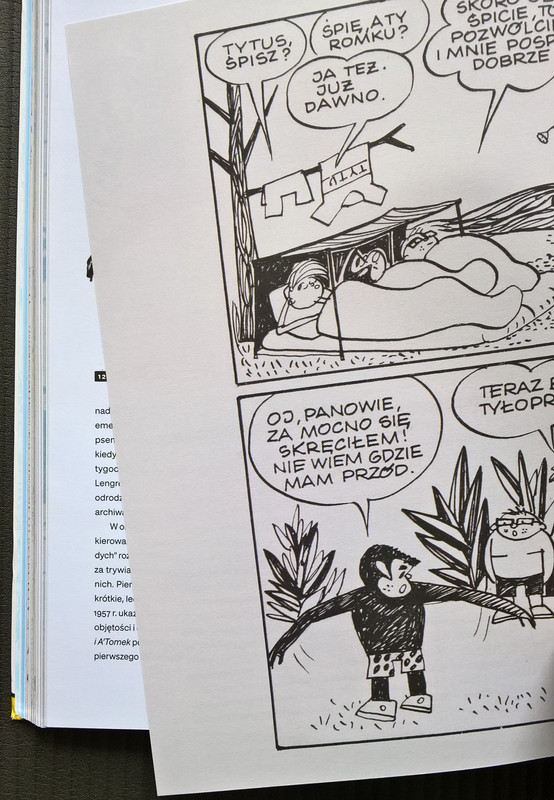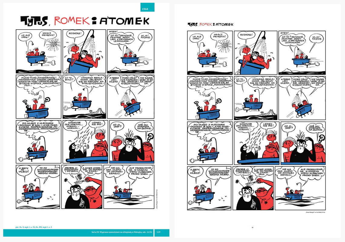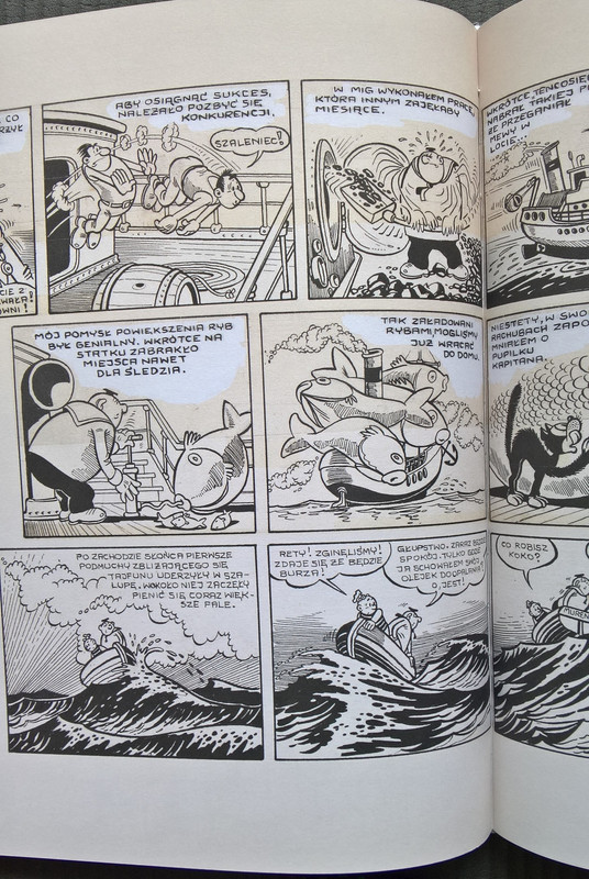 Ja osobiście mam dylemat, bo o ile te ciemne płaskie plamy koloru nie wyglądają dobrze i te pokazane na tym wydaniu fanowskim są dużo fajniejsze (te niedokładności, przycierki itd.), o tyle samą kreskę warto jednak chyba spróbować trochę podkręcić w kontraście. Takie drukowanie jeden do jednego skanów z gazety z tymi wszystkimi niedoskonałościami ówczesnej poligrafii ma swój urok, ale jednak chyba też warto zrobić to tak, jakby się dysponowało oryginalnymi planszami. Na pewno Papcio nie był zachwycony kiedy sobie porównywał swoje oryginały z tym co później widział w druku. A dziś te gazety dodatkowo pożółkły, wyblakły i też nie wyglądają tak jak wówczas kiedy się ukazywały. Rozumiem umiłowanie do takiego podniszczonego feelingu bo sam to bardzo lubię, ale też rozumiem, że wydawca chce, żeby to jakościowo wyglądało lepiej niż stara powycierana gazeta. Najlepiej byłoby tu poszukać jakiegoś złotego środka i te plamy koloru na pewno warto rozjaśnić, pokombinować z jakimiś narzędziami, które dadzą im więcej analogowego uroku. Domyślam się, że przy tej ilości materiału, to jest dużo roboty, ale może jednak warto nawet kosztem przesunięcia premiery.