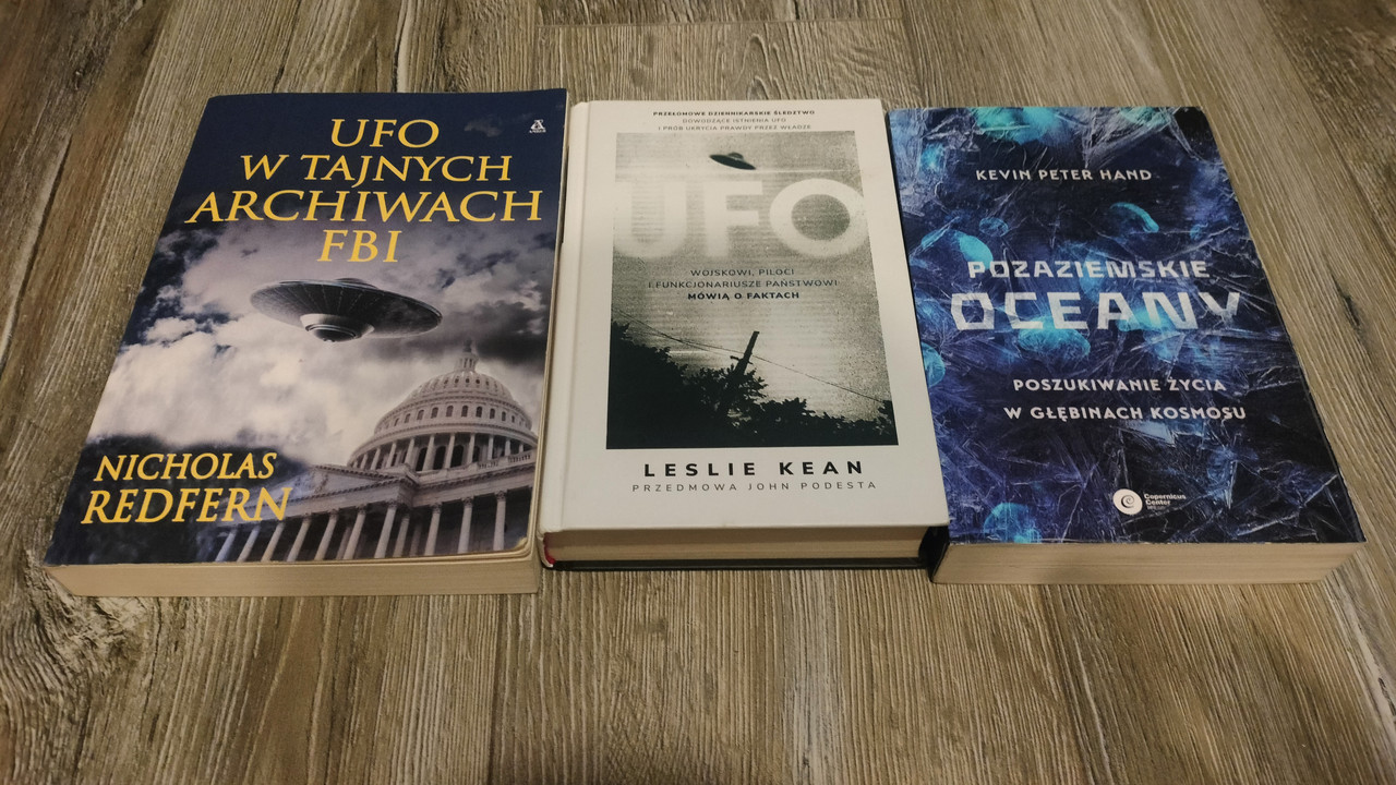 Polecam lektury, z tematu paranaukowego i ufologicznego, jedne z najlepszych na polskim rynku: te dwie od lewej strony na zdjęciu. Pierwsza z prawej książka, to już mocny trzon nauk ścisłych, w tym kosmologicznych, bardziej na poważnie traktująca możliwość życia we Wszechświecie i ewentualnego ,,z nim kontaktu".