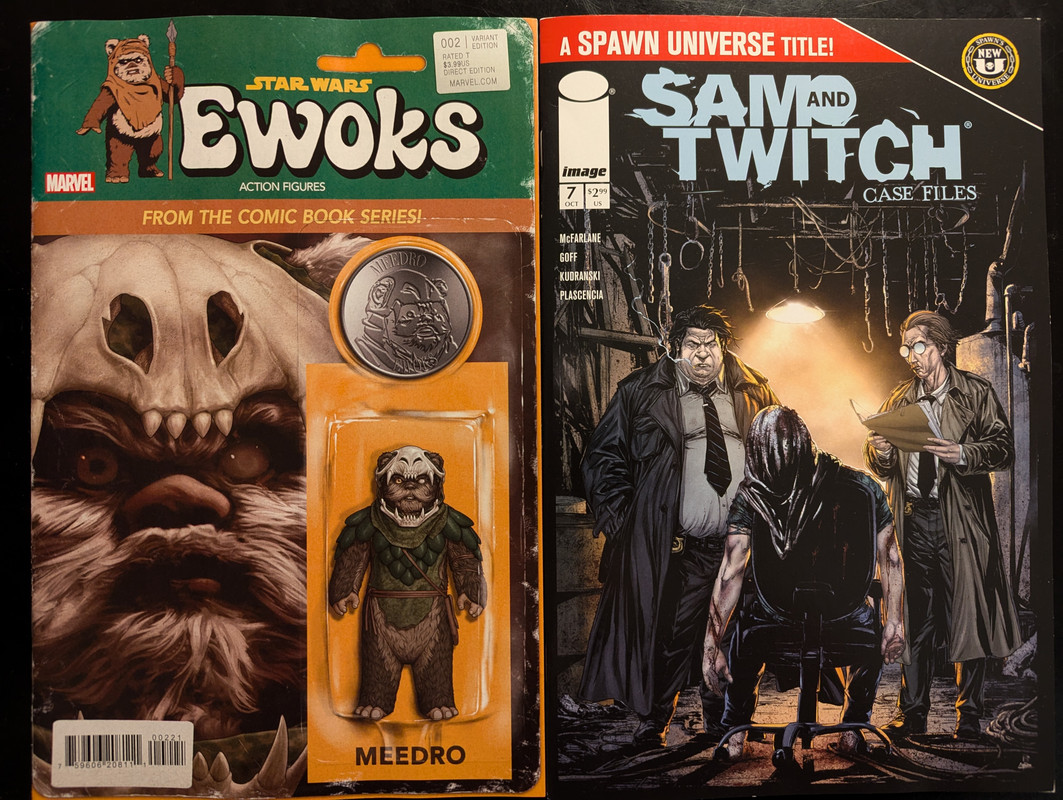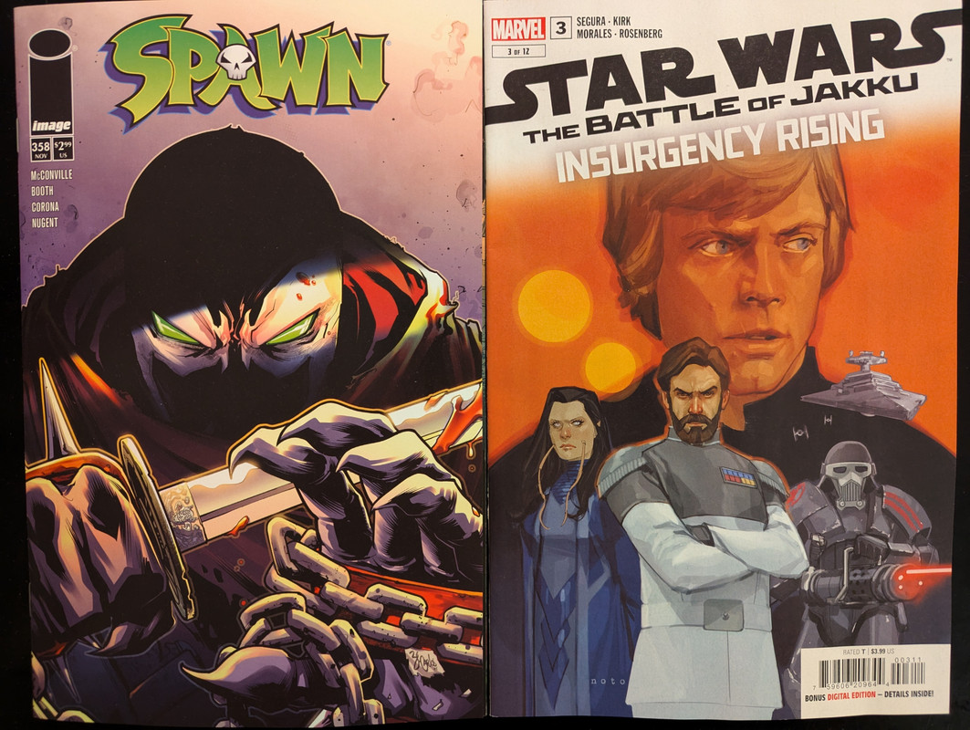 Bez szalenstw w tym miesiacu, jeden omniak, piec zbiorczych a reszta to oczywiscie zeszyty: ostatni, brakujacy wariant do Spawn Kills Every Spawn, serie Ewoks i The Battle of Jakku zakonczone, Spawn dotarl juz do numeru 360 a z nowosci jest one shot A New Legacy.