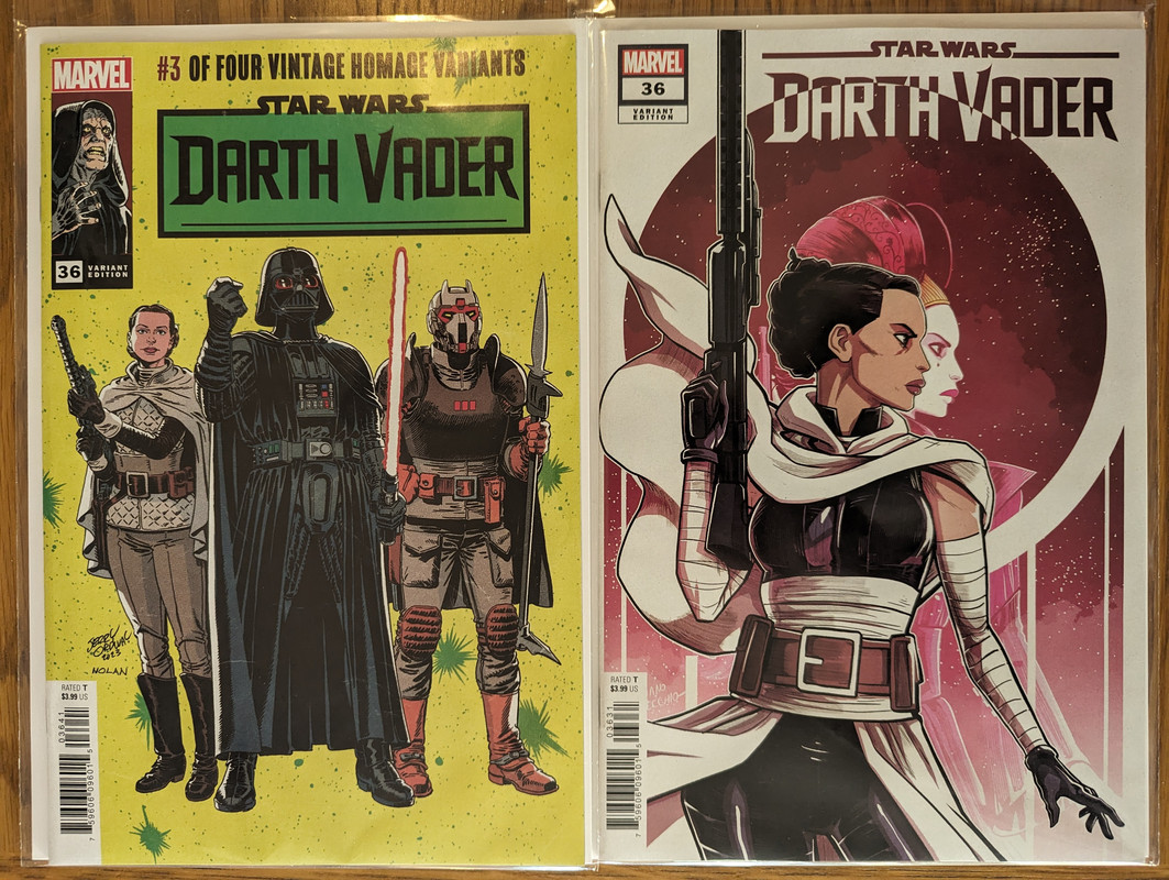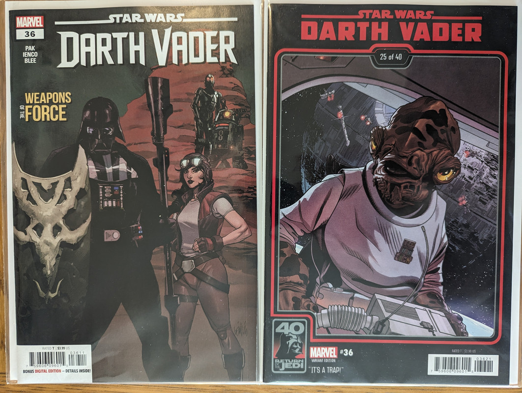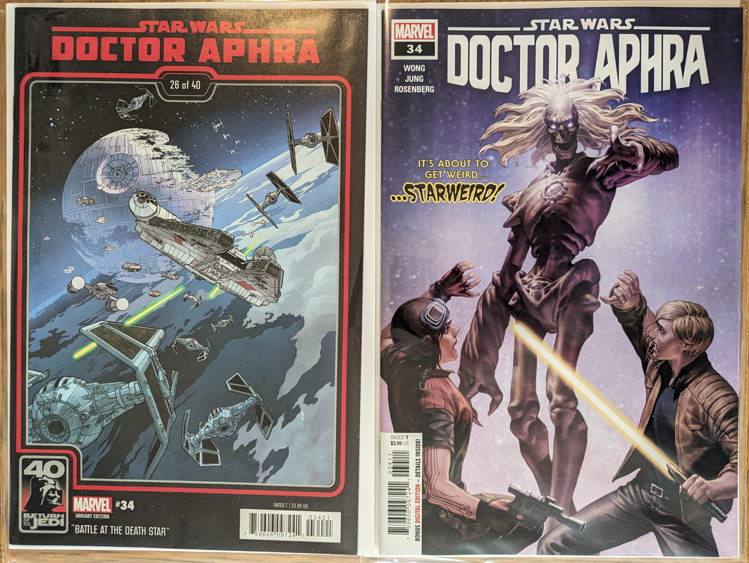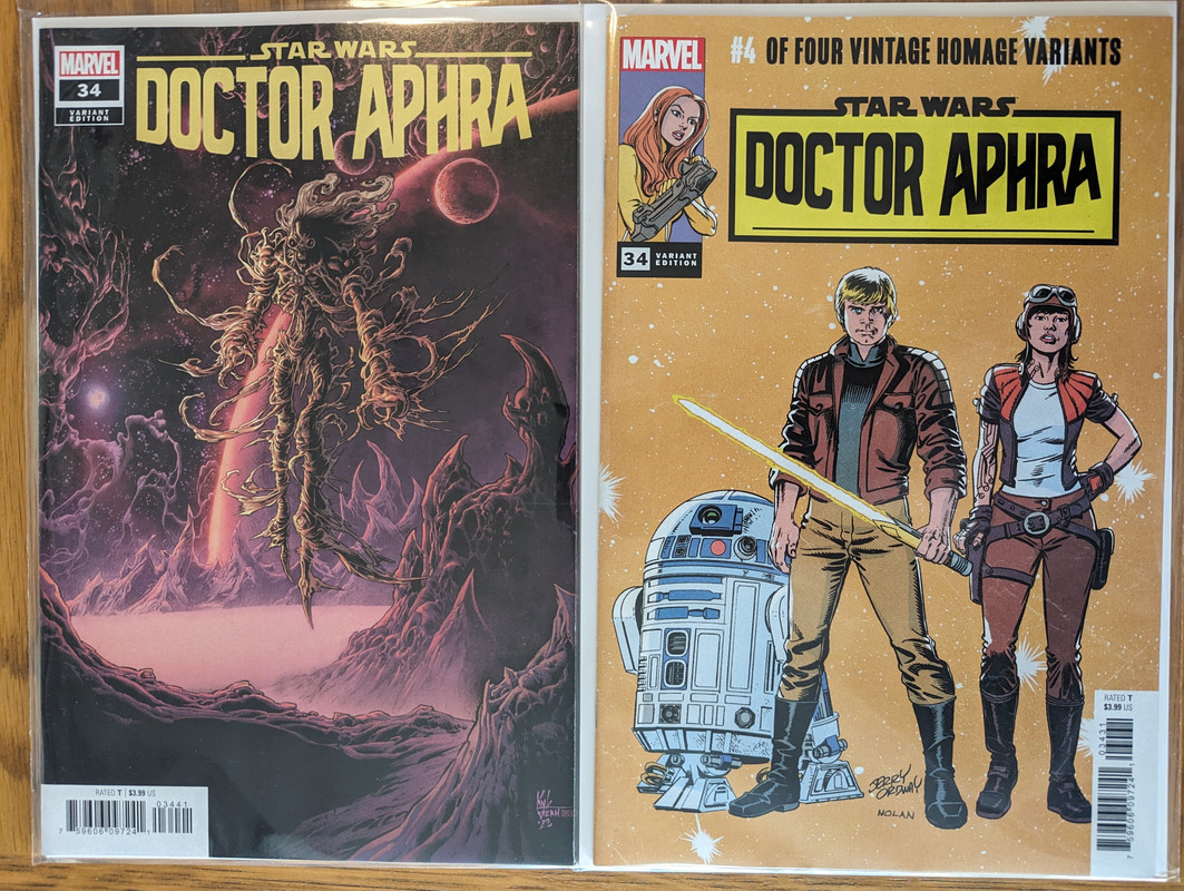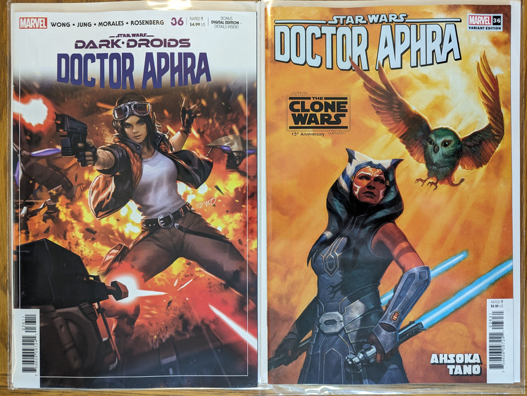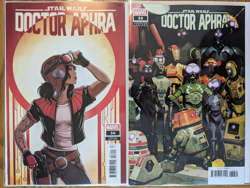 W najblizszych miesiacach bedzie jeszcze wiecej tych virgin wariantow bo jesli nie daja ich jako 1:100 retailer incentive (jak we wszystkich one shotach ROTJ) to sklepy wrzucaja je jako swoje wlasne warianty - Mandalorian, Obi-Wan czy Aphra, ktora bedzie miala 3 virginy sklepowe w dwoch numerach (36 i 37)